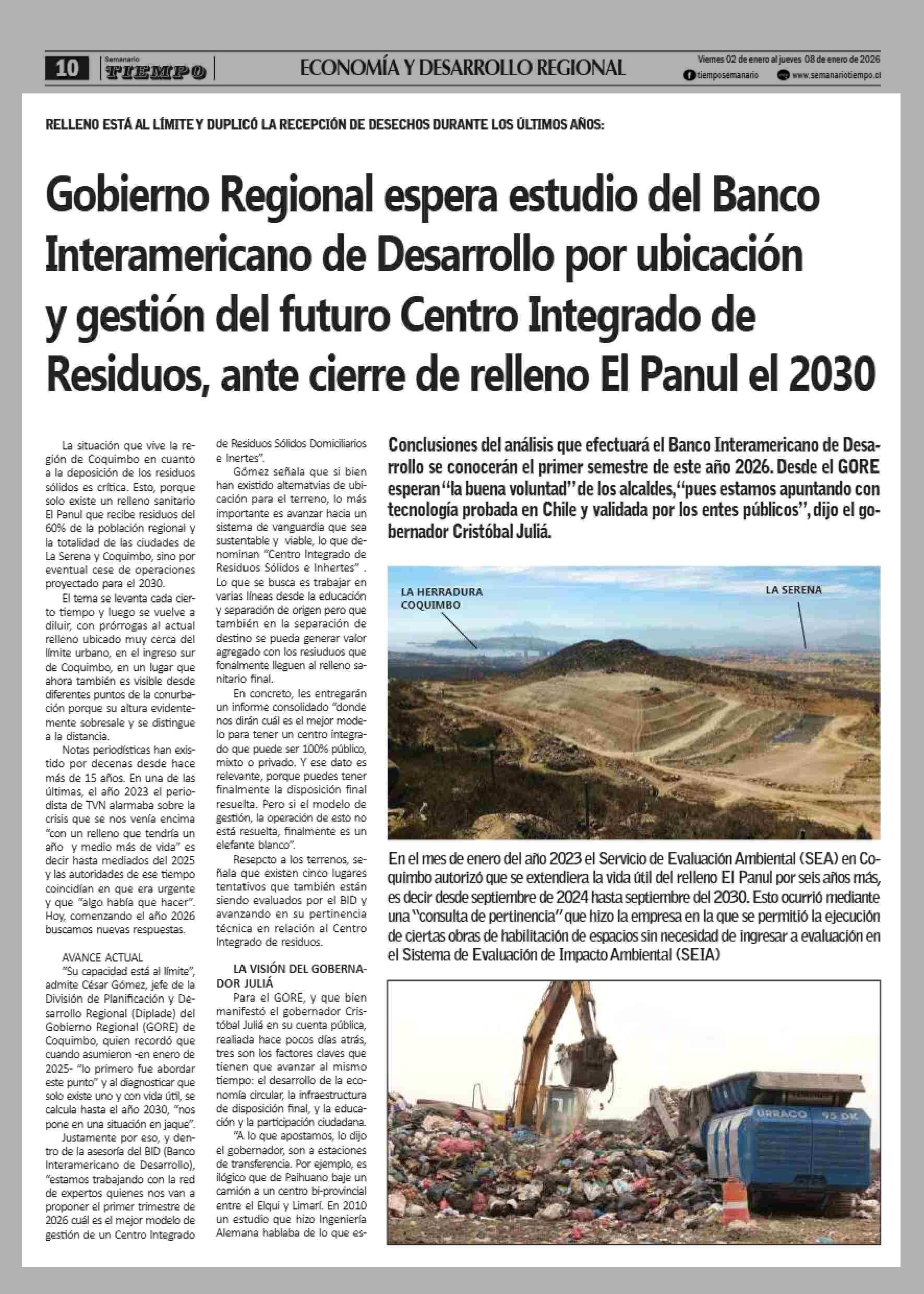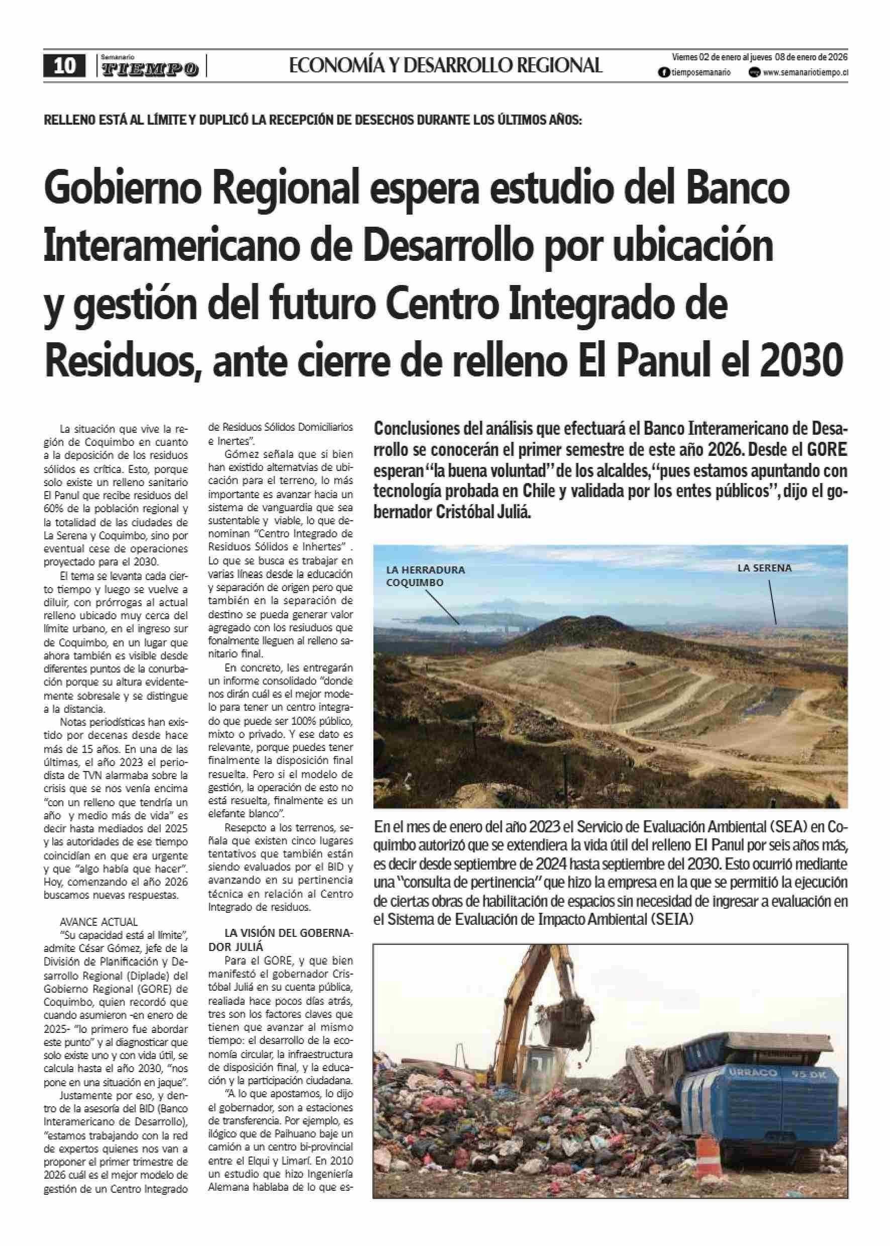 | Título: | Gobierno Regional espera estudio del Banco Interamericano de Desarrollo por ubicación y gestión del futuro Centro Integrado de Residuos, ante cierre de relleno El Panul el 2030 |