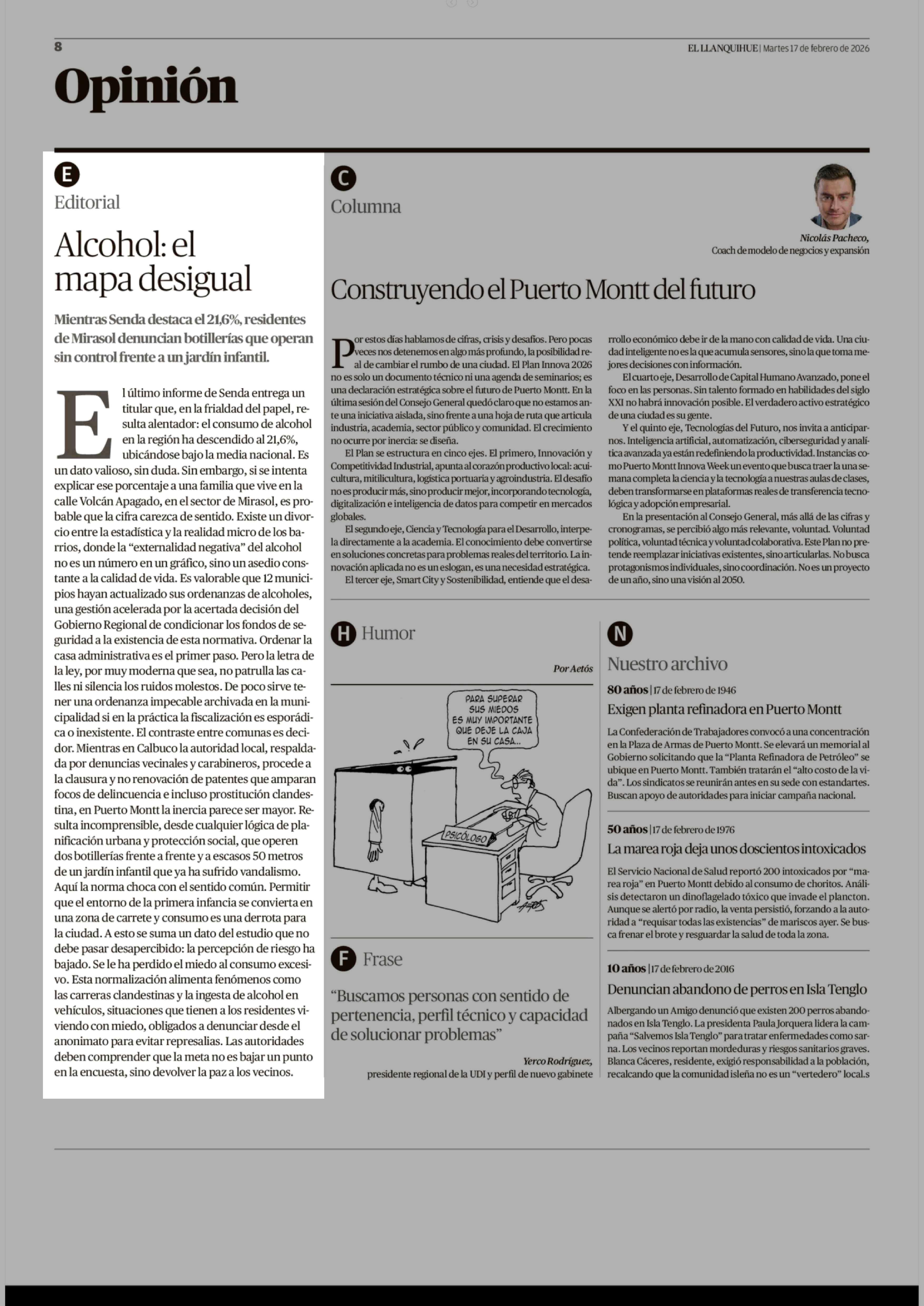 Editorial: Alcohol: el mapa desigual 17-02-2026 El Llanquihue |