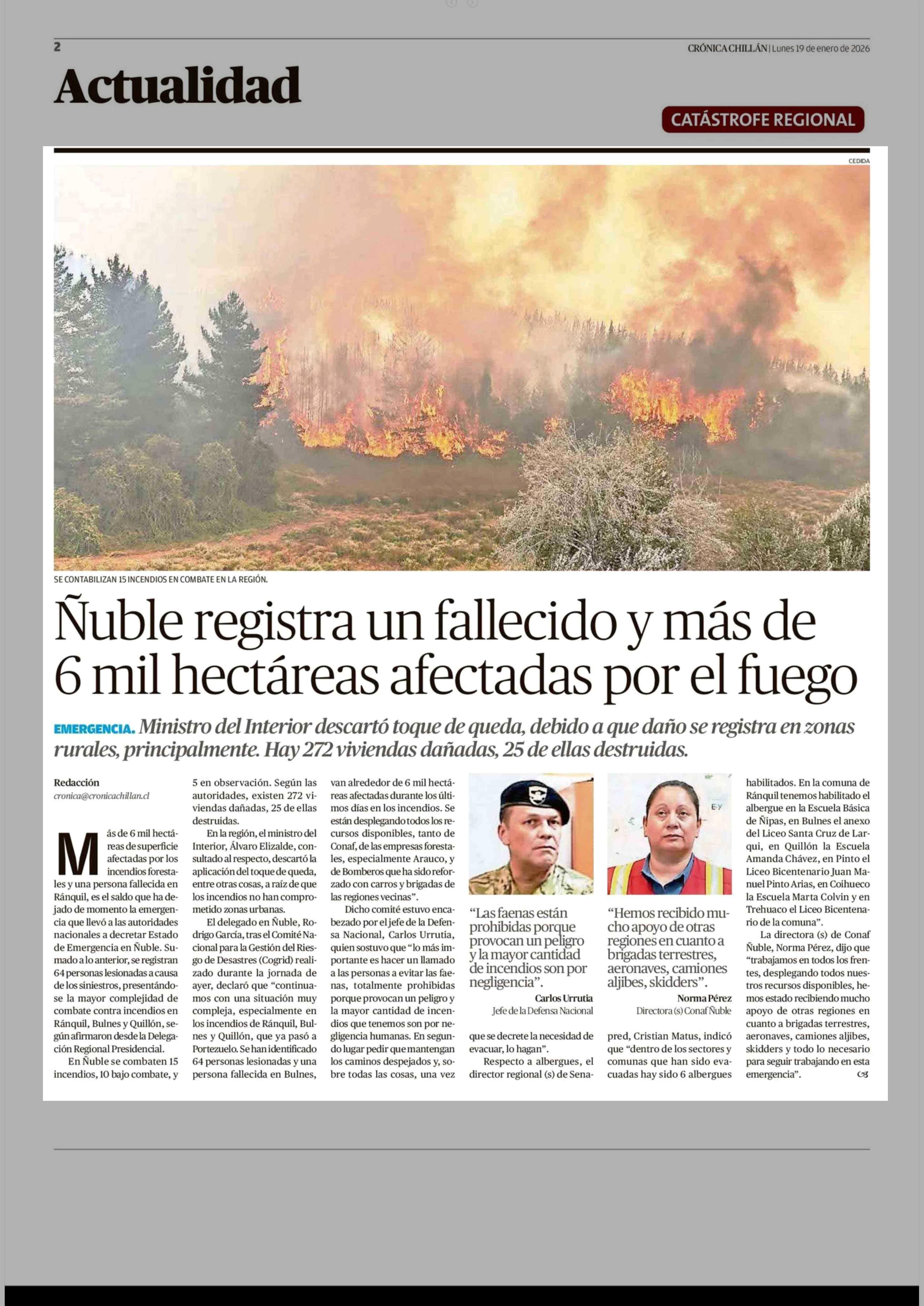 Ñuble registra un fallecido y más de 6 mil hectáreas afectadas por el fuego 19-01-2026 Crónica de Chillán |