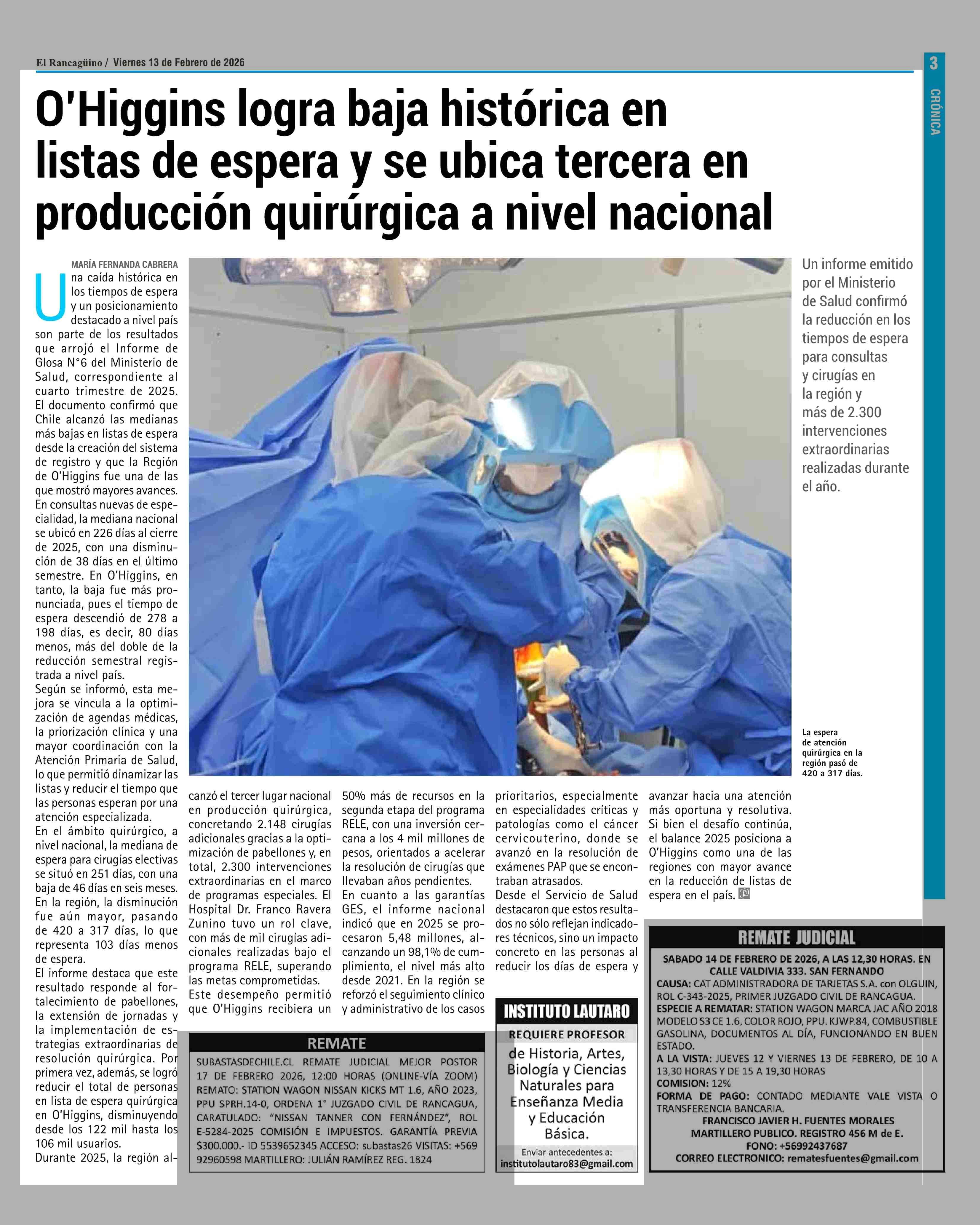 O'Higgins logra baja histórica en listas de espera y se ubica tercera en producción quirúrgica a nivel nacional 13-02-2026 El Rancagüino |