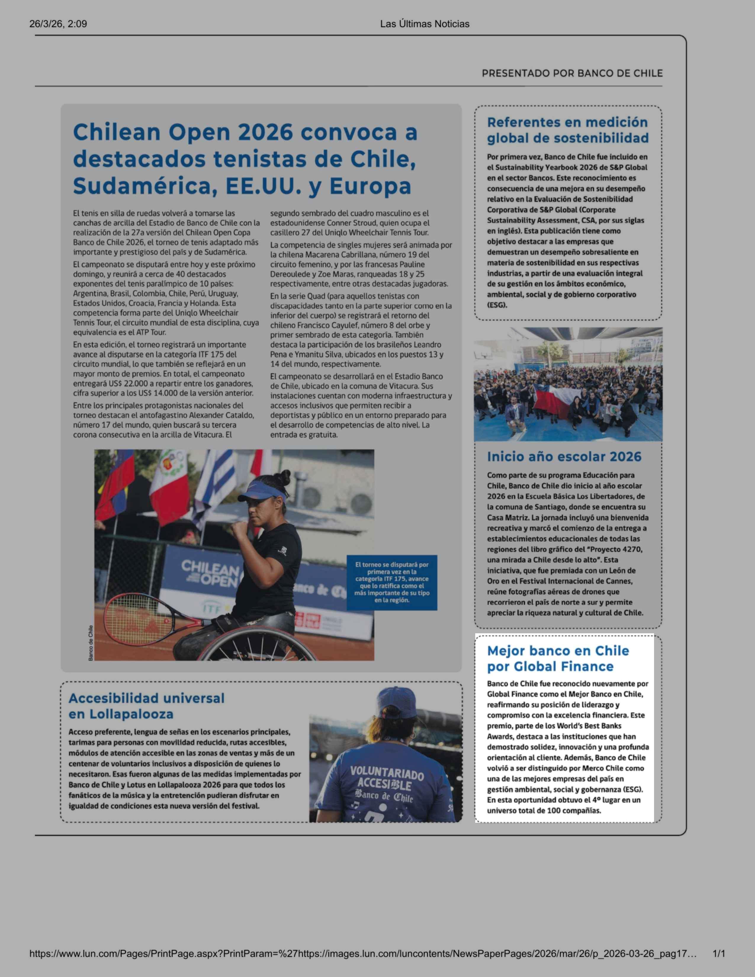 Mejor banco en Chile por Global Finance 26-03-2026 Las Últimas Noticias |