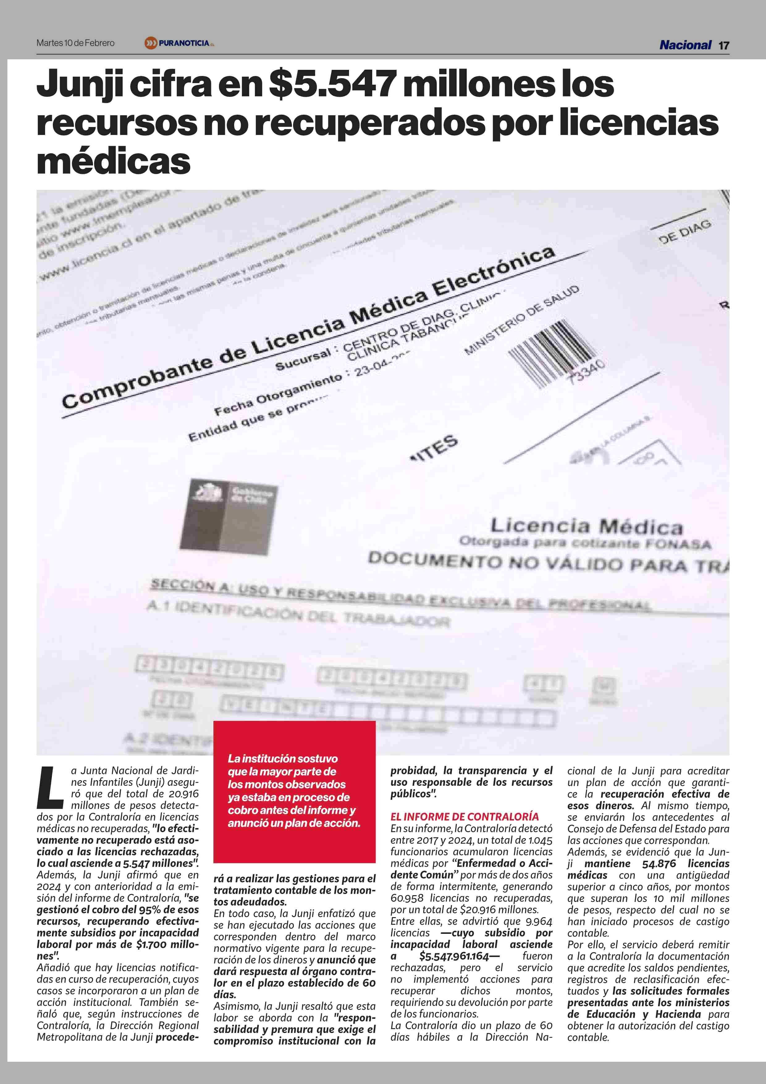 Junji cifra en $5.547 millones los no recuperados por licencias médicas 10-02-2026 Puranoticia.cl |