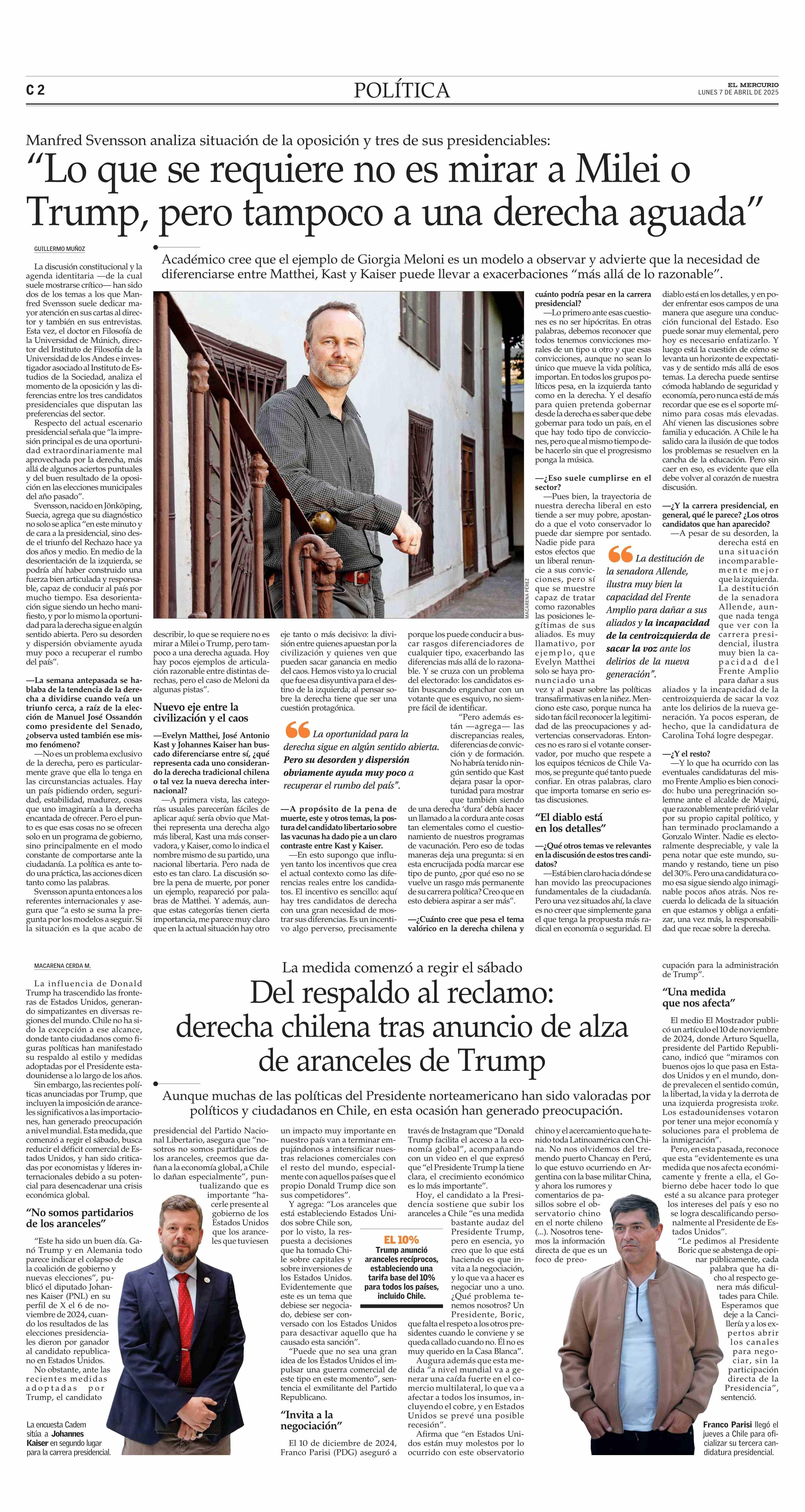 “Lo que se requiere no es mirar a Milei o Trump, pero tampoco a una derecha aguada” 07-04-2025 El Mercurio |