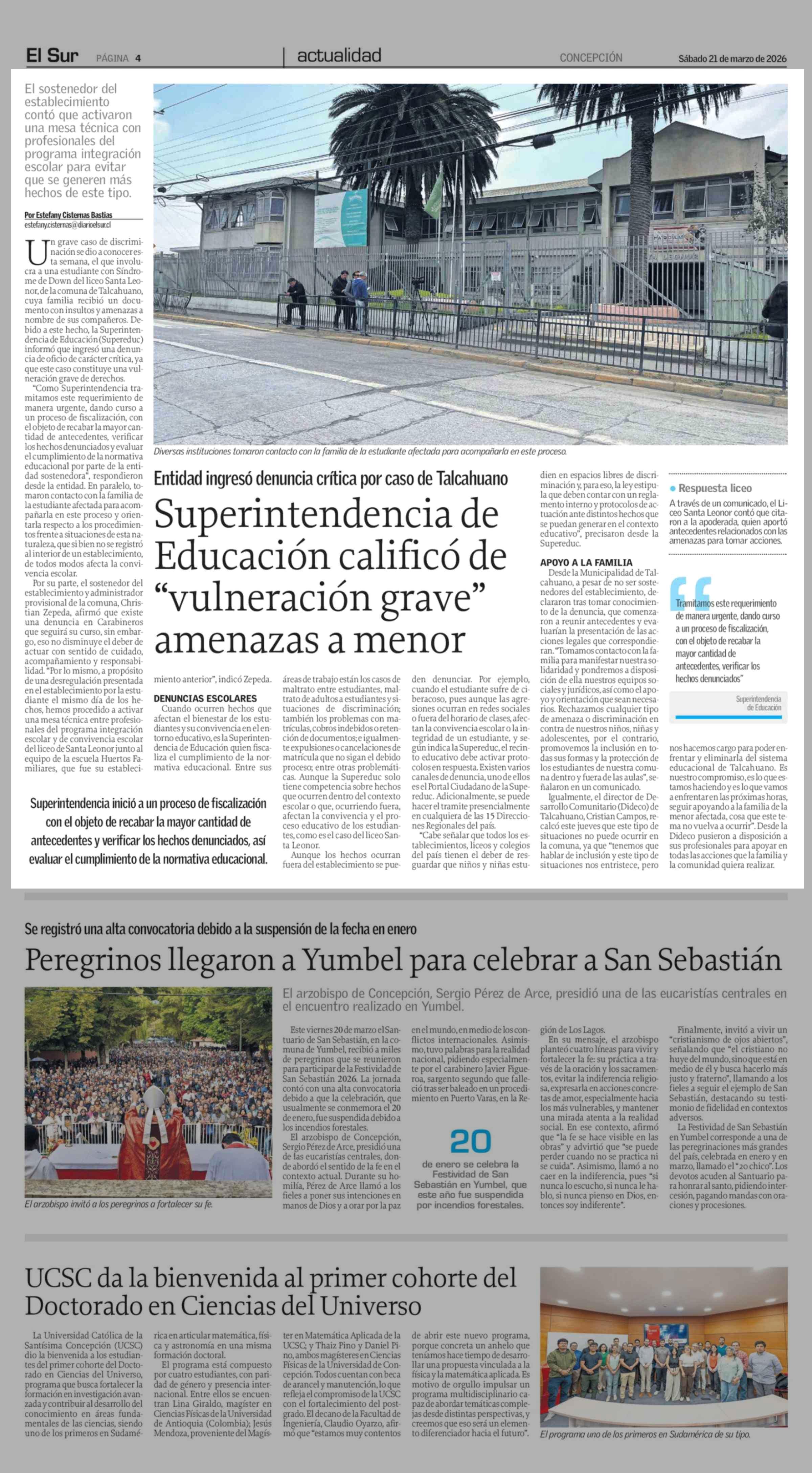 Superintendencia de Educación calificó de "vulneración grave" amenazas a menor 21-03-2026 El Sur |