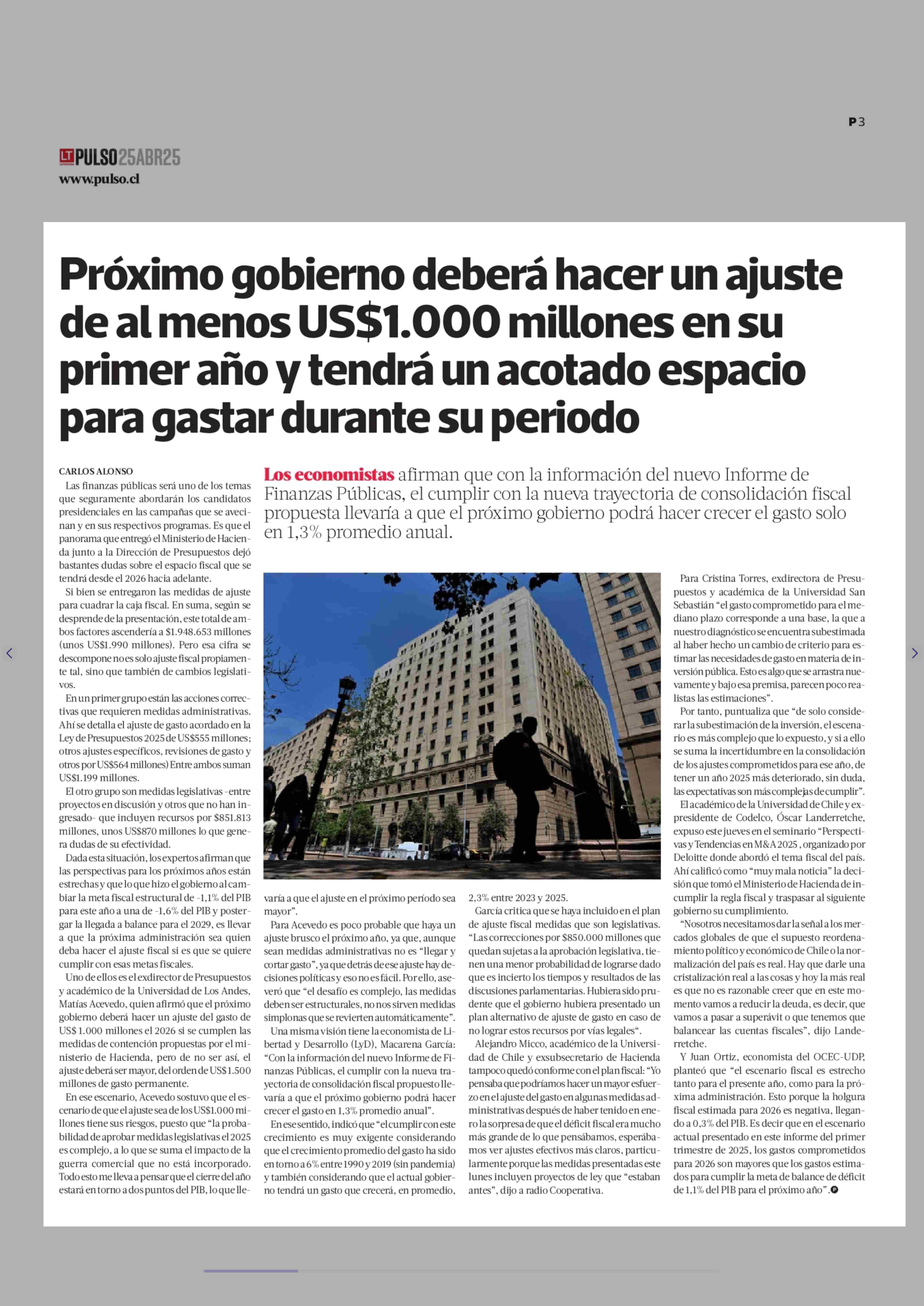 Próximo gobierno deberá hacer un ajuste de al menos US$1.000 millones en su primer año y tendrá un acotado espacio para gastar durante su periodo 25-04-2025 La Tercera |