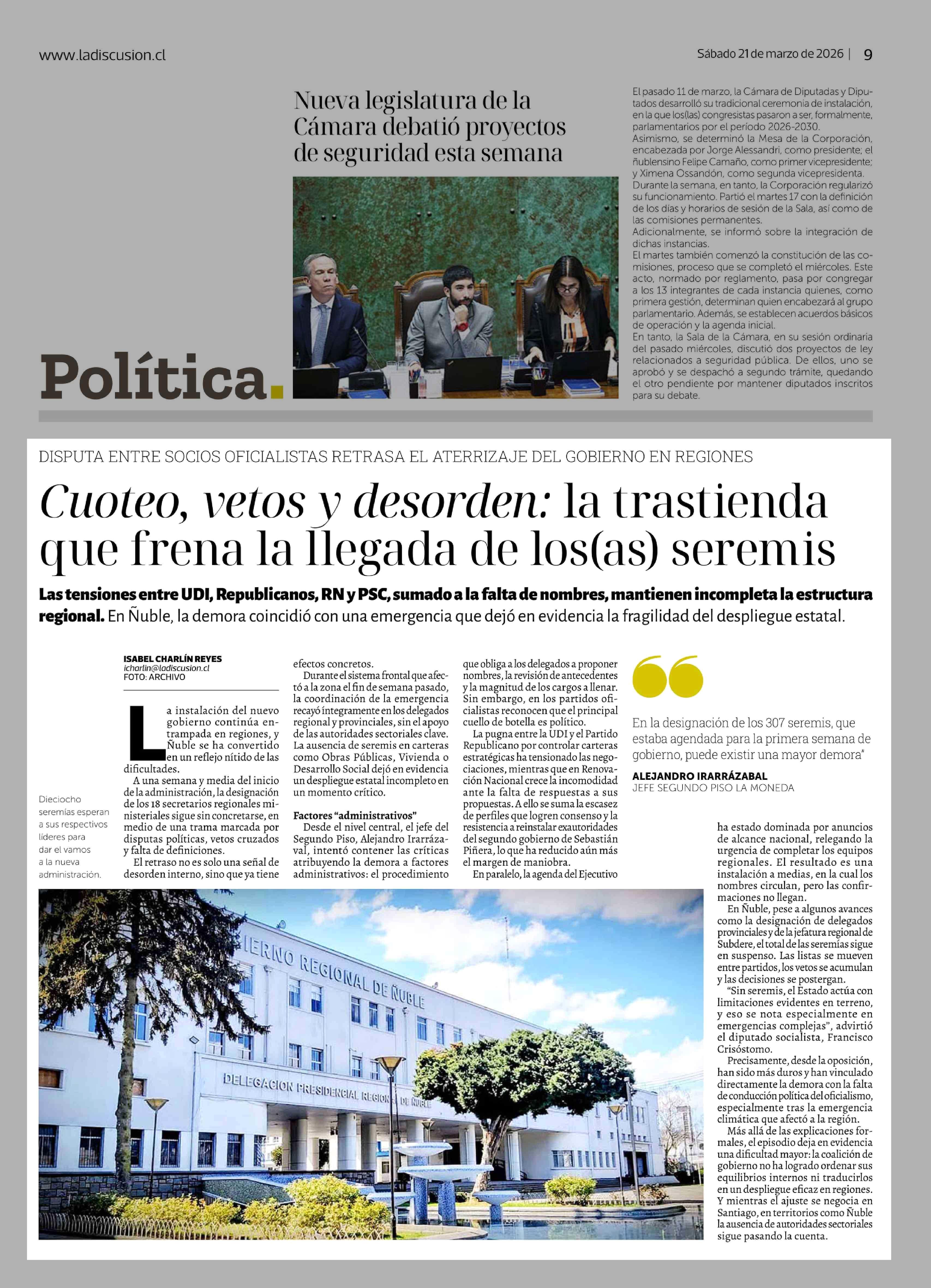 Cuoteo, vetos y desorden: la trastienda que frena la llegada de los(as) seremis 21-03-2026 La Discusión |