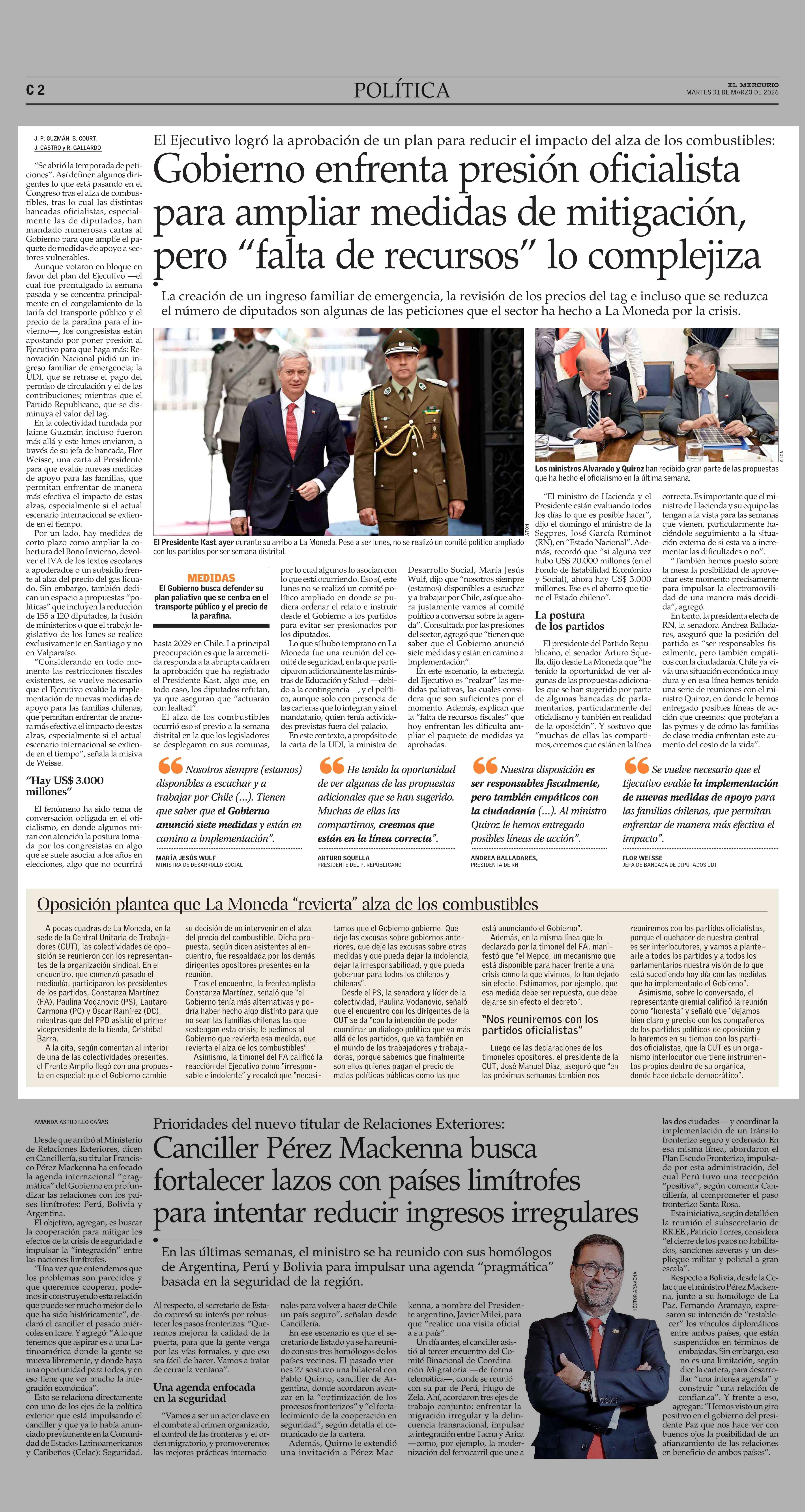 Gobierno enfrenta presión oficialista para ampliar medidas de mitigación, pero “falta de recursos” lo complejiza 31-03-2026 El Mercurio |