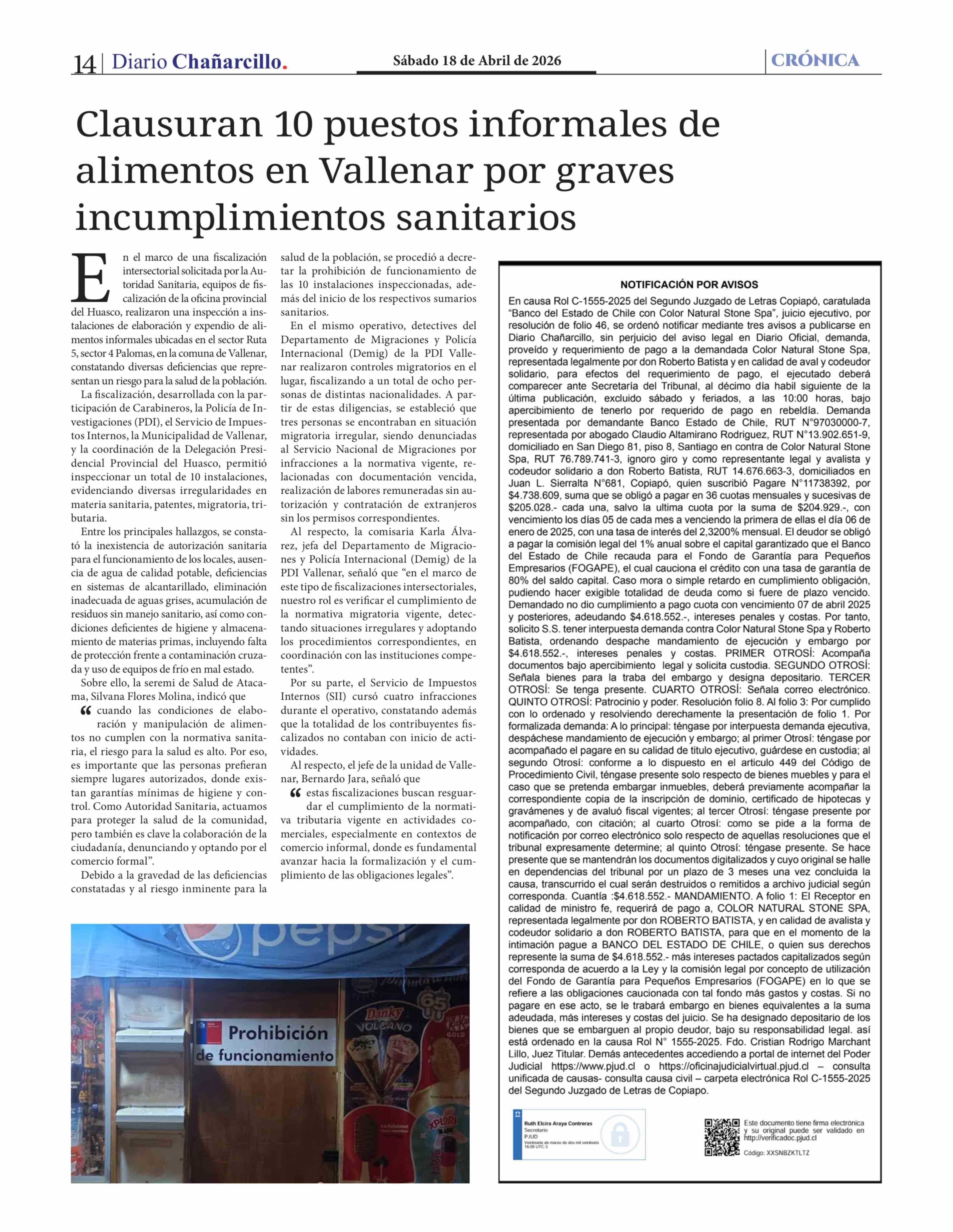 | Título: | Clausuran 10 puestos informales de alimentos en Vallenar por graves incumplimientos sanitarios |