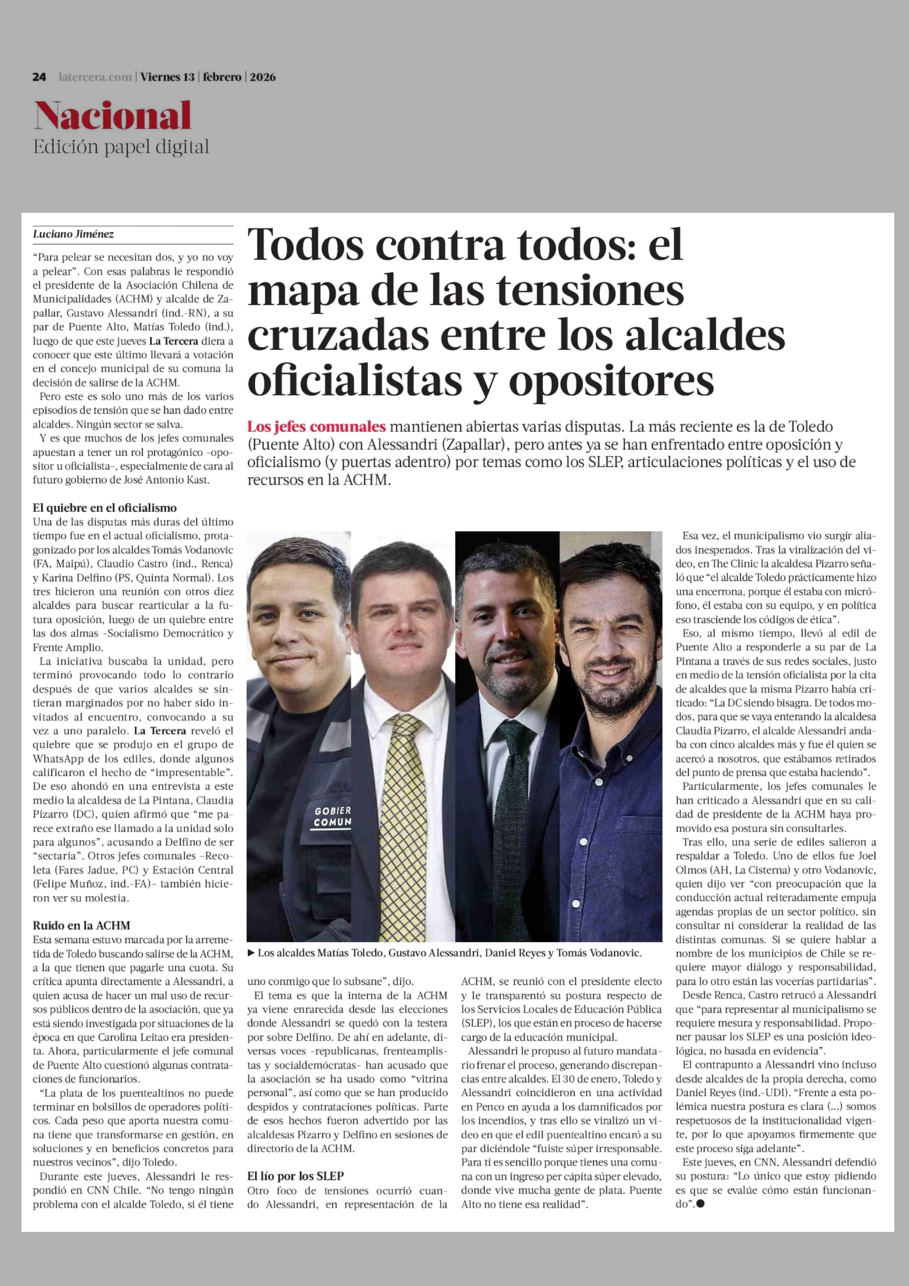 Todos contra todos: el mapa de las tensiones cruzadas entre los alcaldes oficialistas y opositores 13-02-2026 La Tercera |