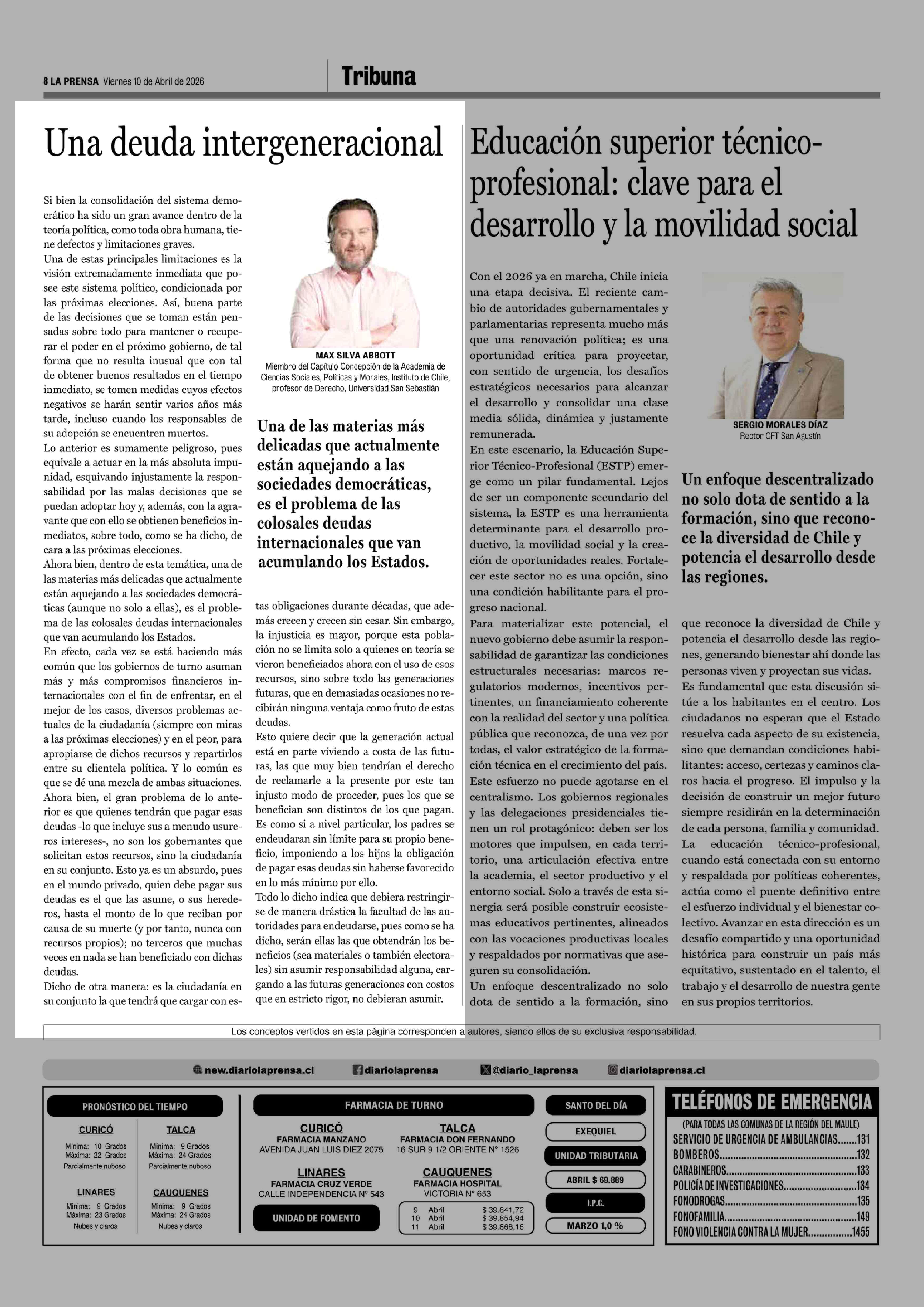 Columnas de Opinión: Una deuda intergeneracional 10-04-2026 La Prensa de Curicó |