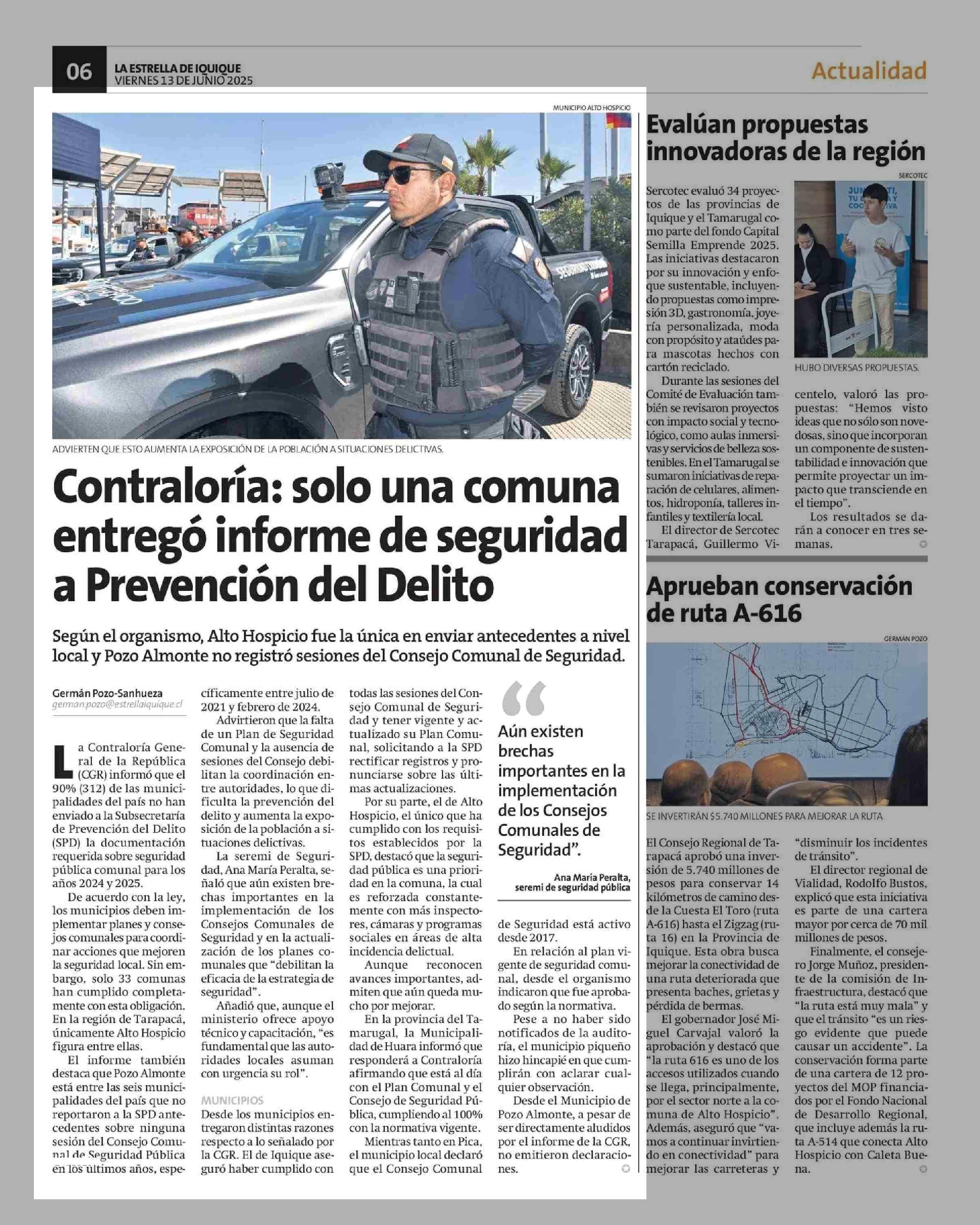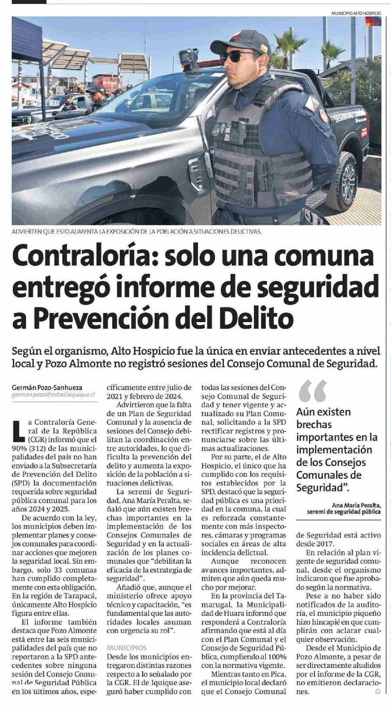 Contraloría: solo una comuna entregó informe de seguridad a Prevención del Delito 13-06-2025 La Estrella de Iquique |