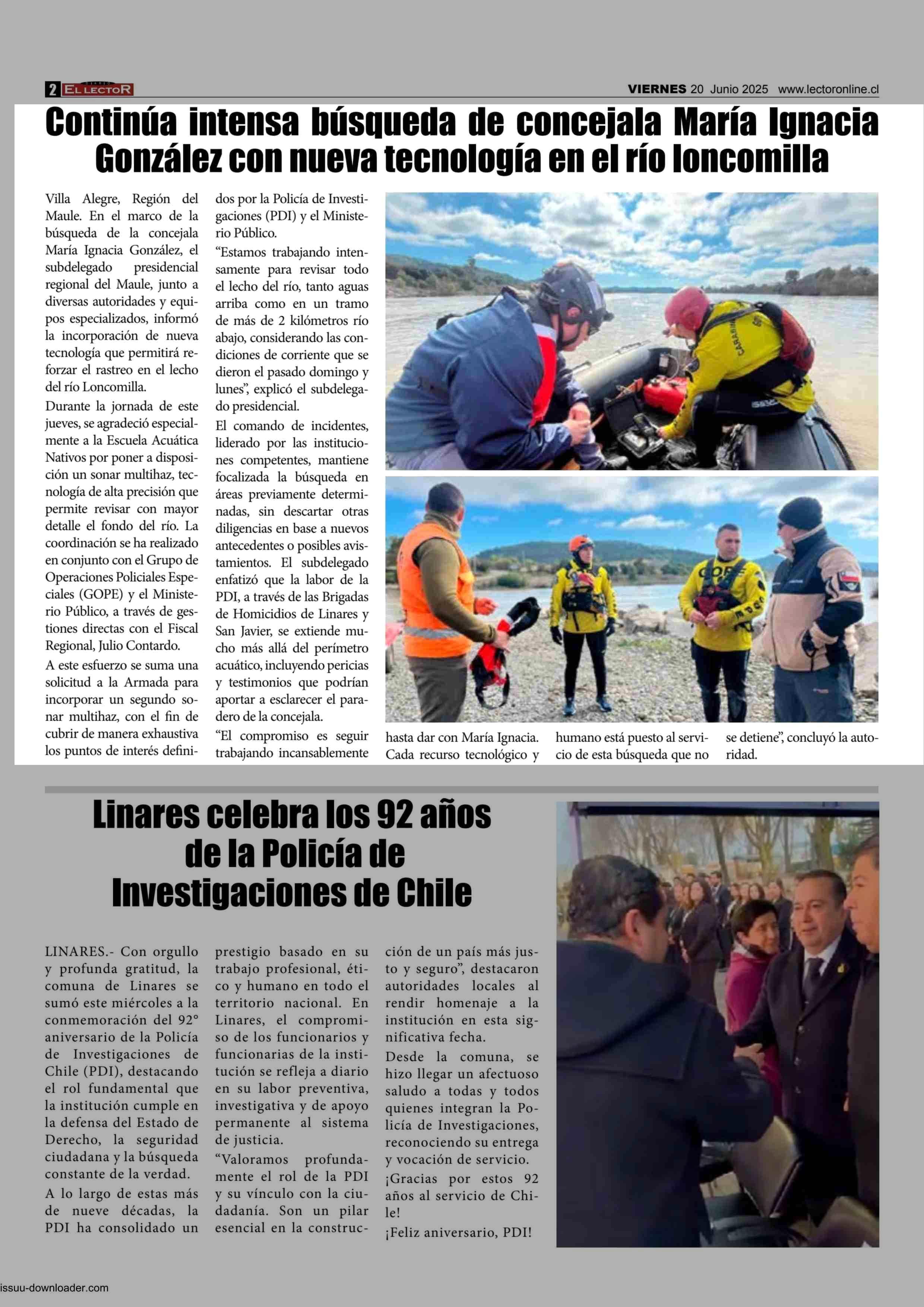 continúa intensa búsqueda de concejala María Ignacia González con nueva tecnología en el río loncomilla 20-06-2025 El Lector |