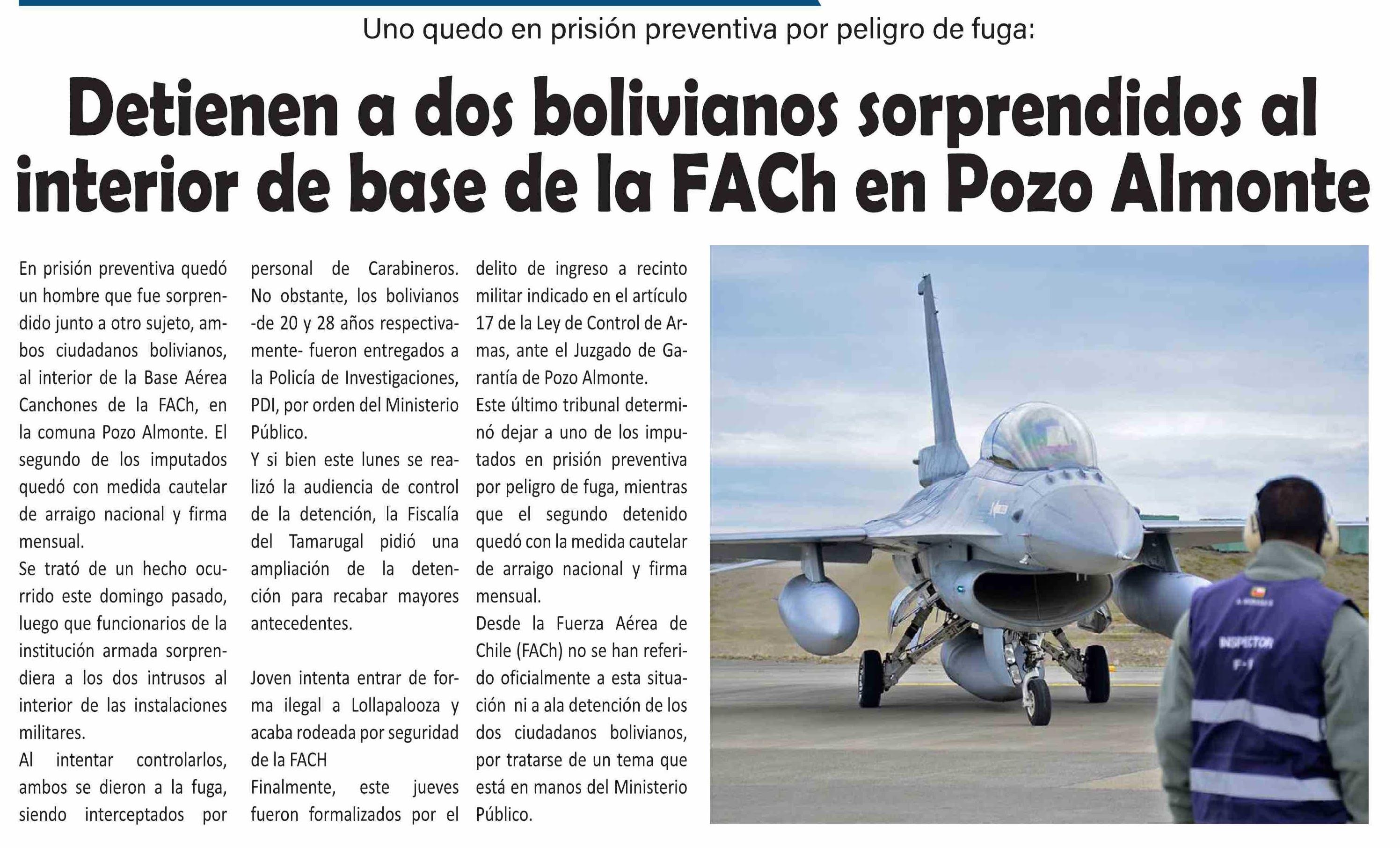 | Título: | Detienen a dos bolivianos sorprendidos al interior de base de la FACh en Pozo Almonte |