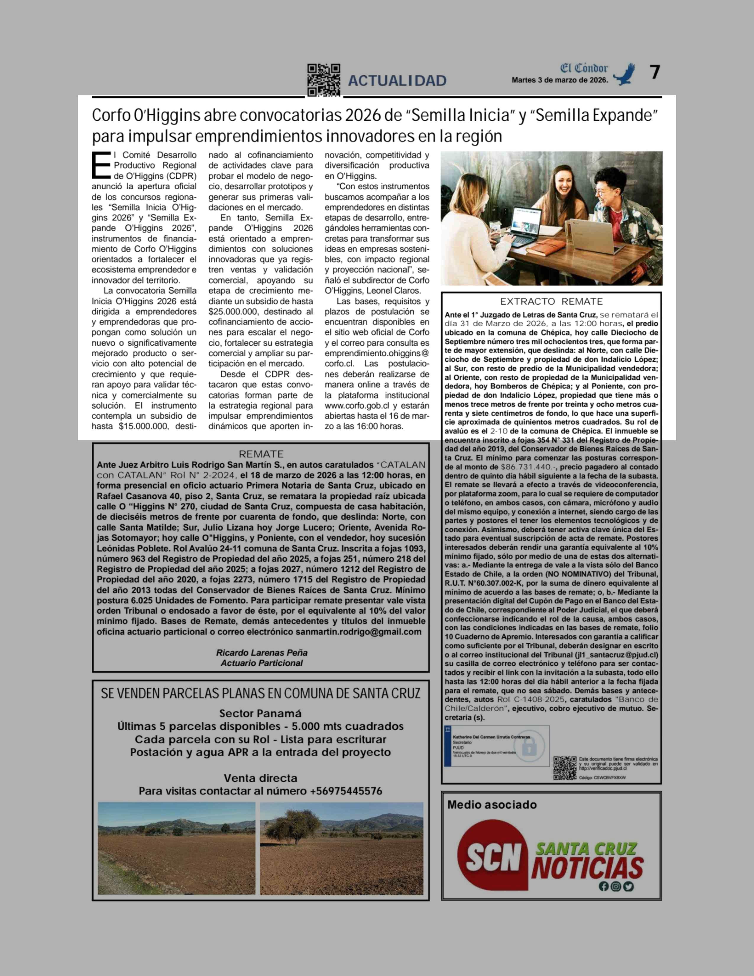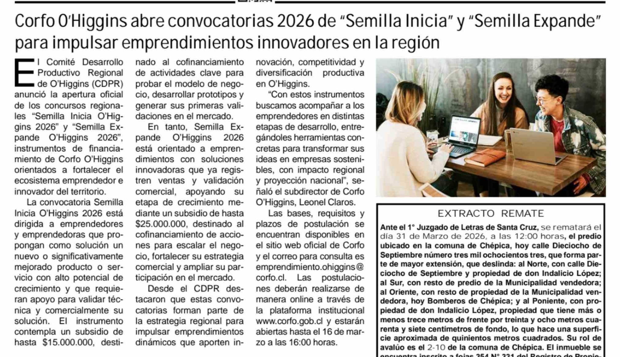 Corfo O'Higgins abre convocatorias 2026 de "Semilla Inicia" y "Semilla Expande" para impulsar emprendimientos innovadores en la región 03-03-2026 Diario El Cóndor |