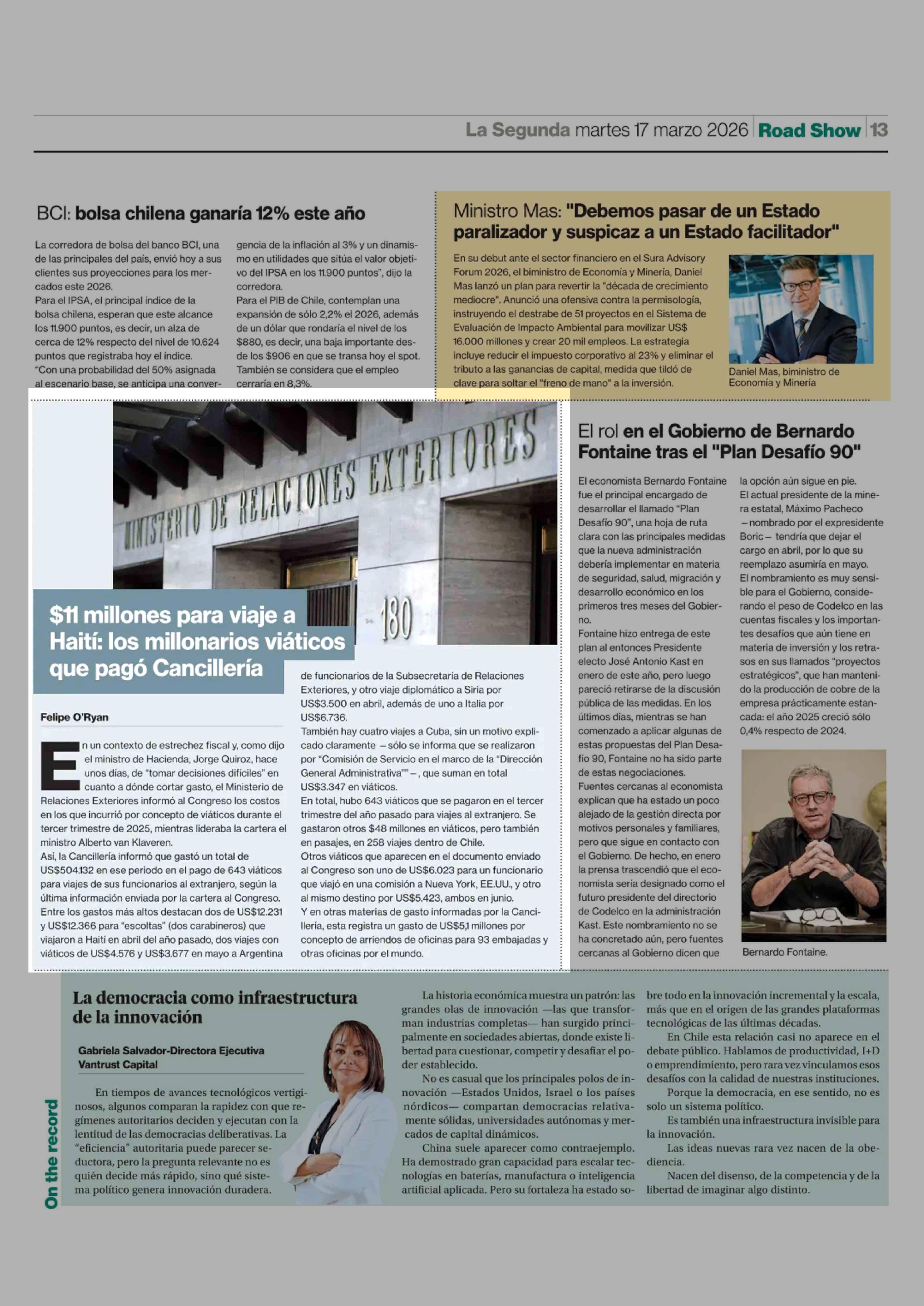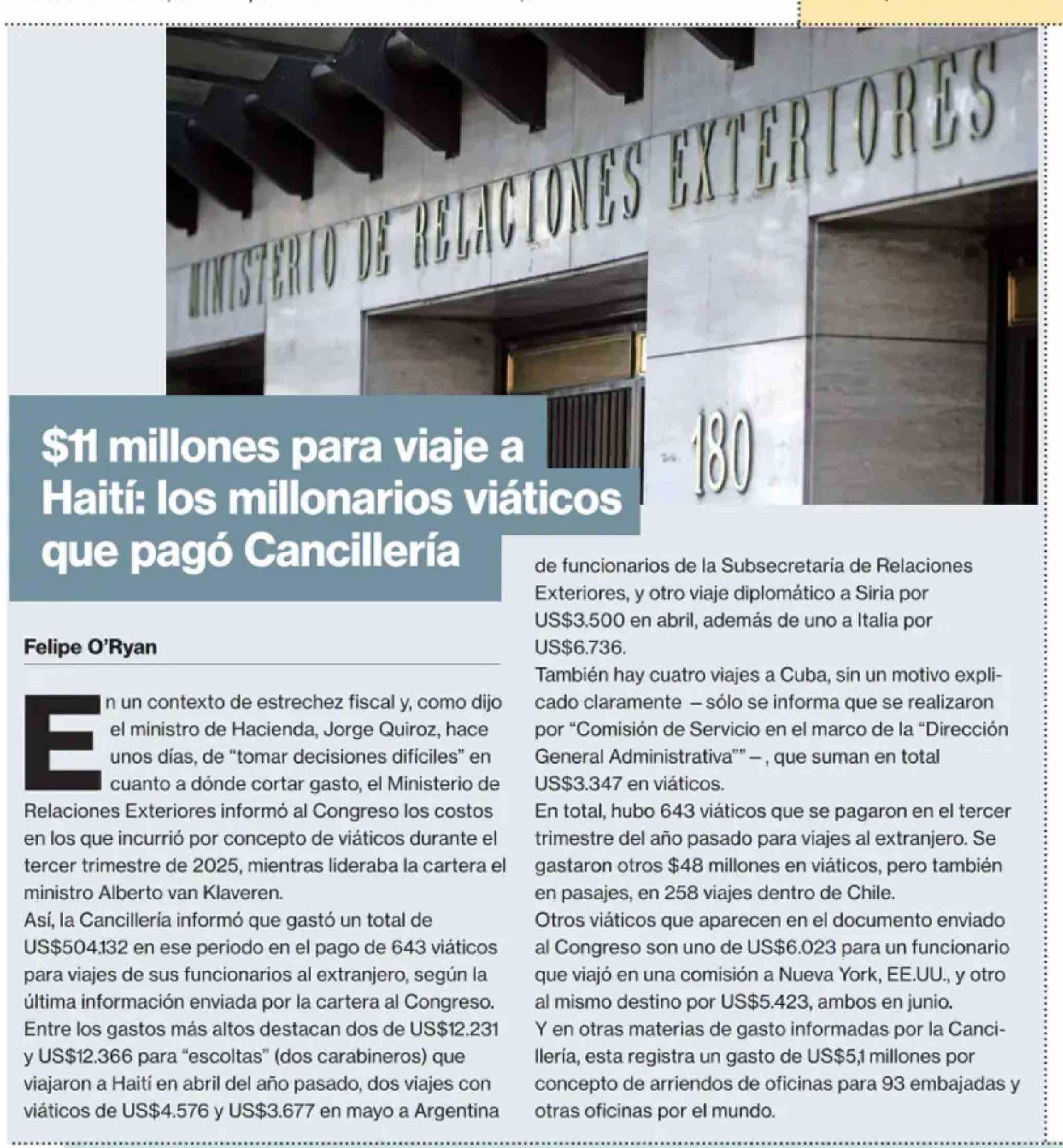 $11 Millones para viaje a Haití: los millonarios viáticos que pagó Cancillería 17-03-2026 La Segunda |