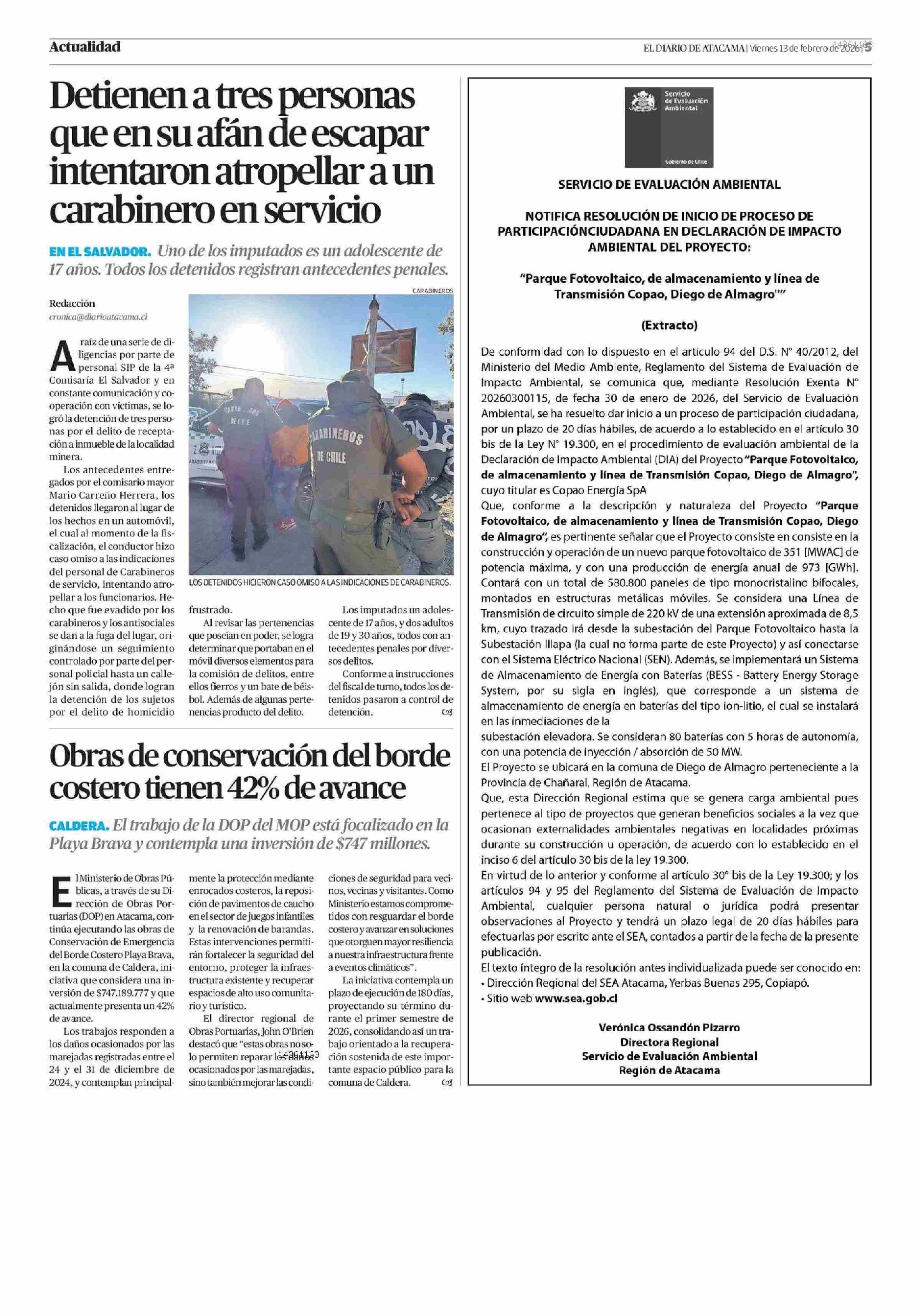 EXTRACTOS: Extracto 13-02-2026 El Diario de Atacama |