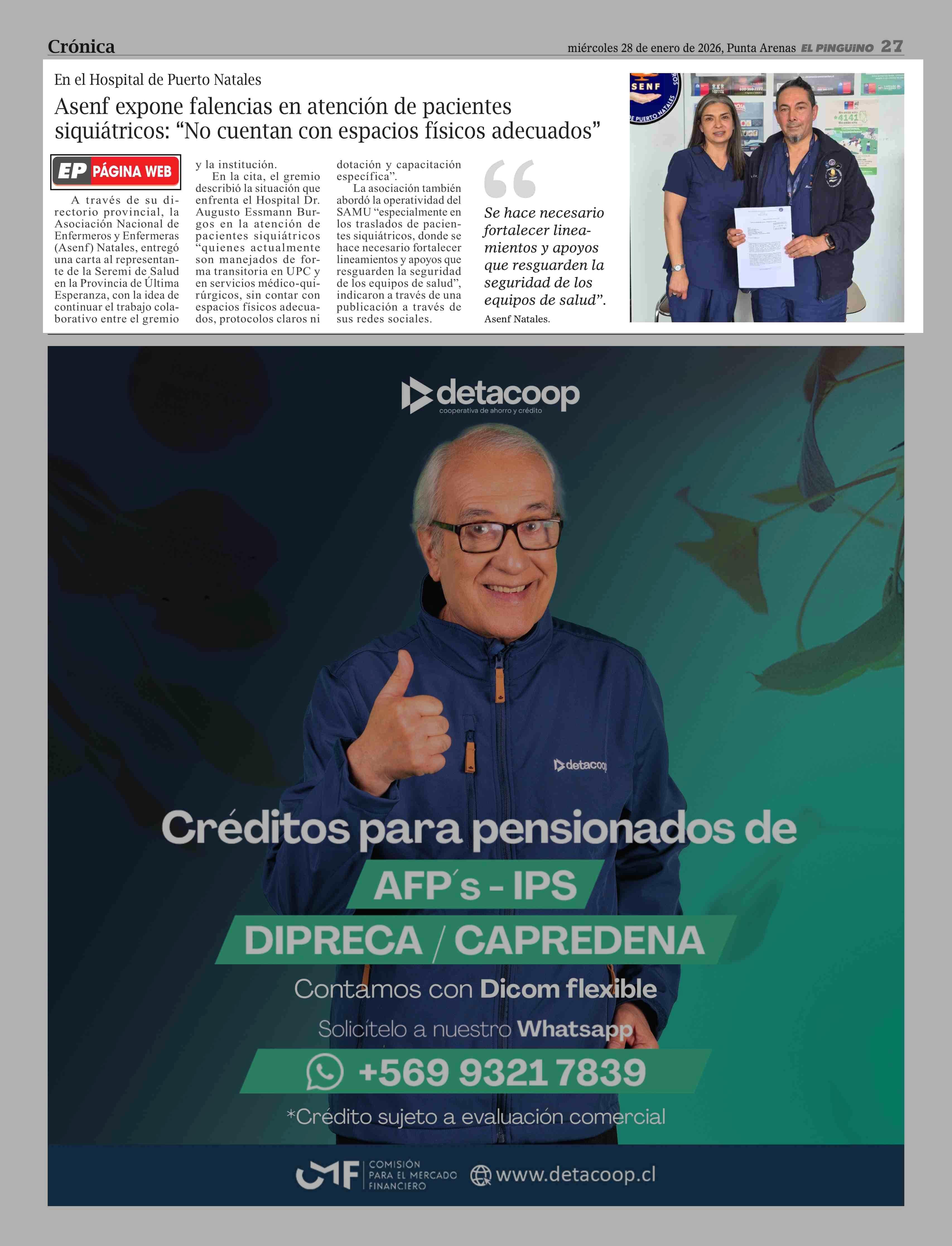 Asenf expone falencias en atención de pacientes siquiátricos: "No cuentan con espacios físicos adecuados" 28-01-2026 El Pingüino |