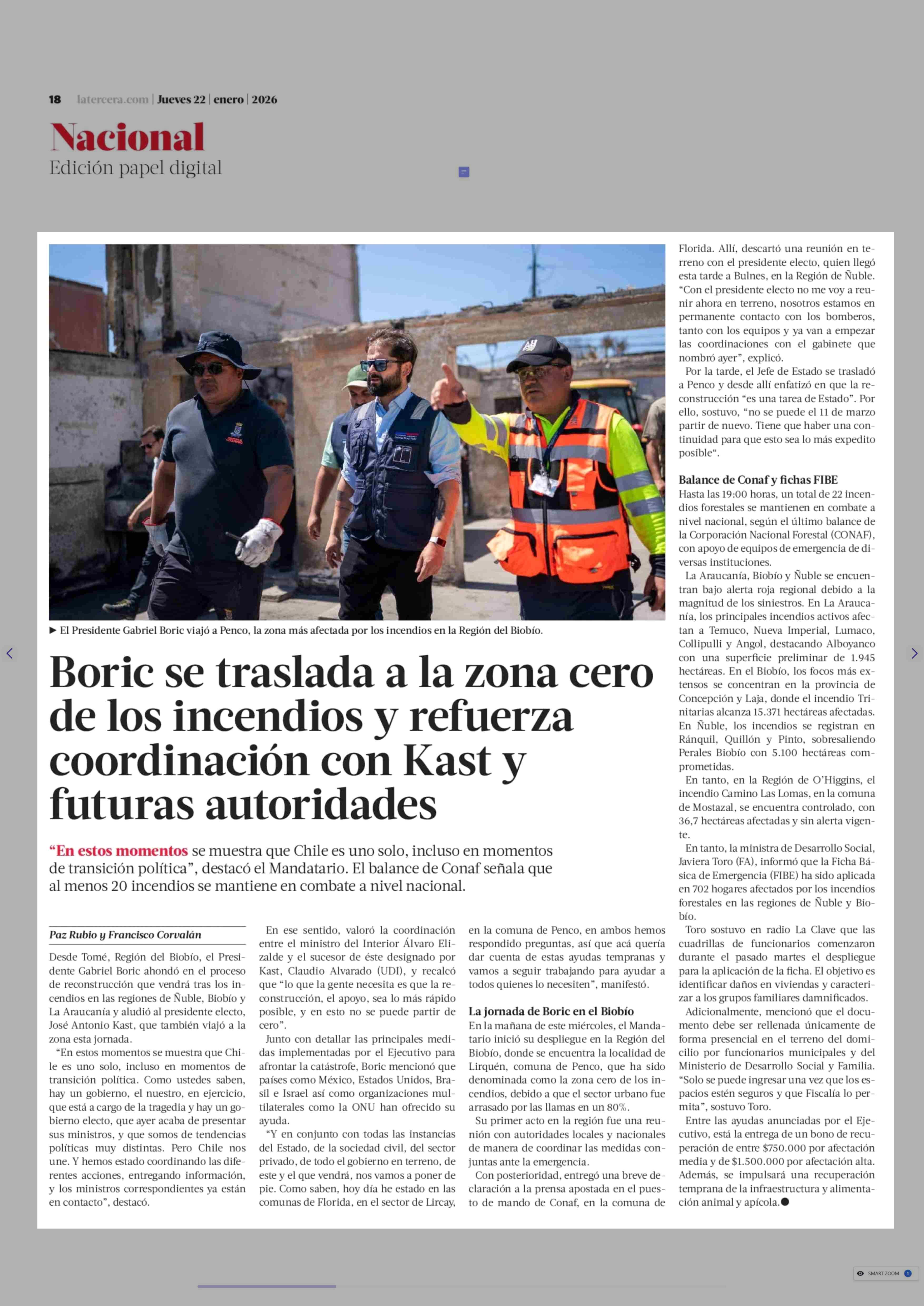 Boric se traslada a la zona cero de los incendios y refuerza coordinación con Kast y futuras autoridades 22-01-2026 La Tercera |