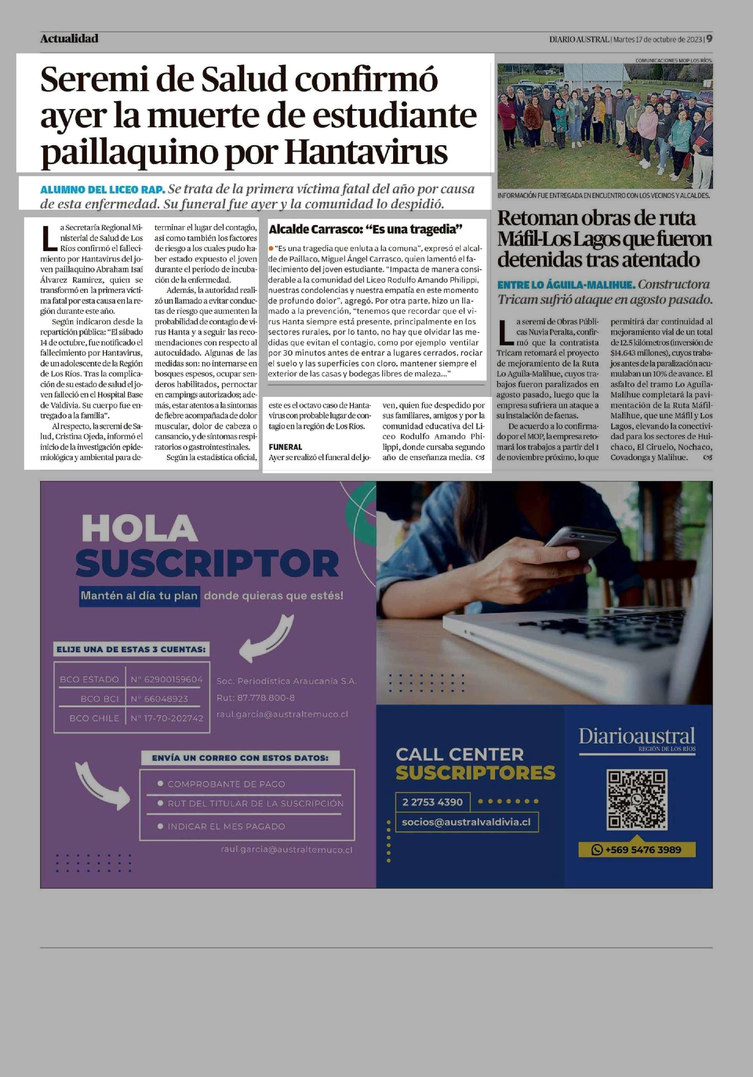 Seremi de Salud confirmó ayer la muerte de estudiante paillaquino por Hantavirus 17-10-2023 Diario Austral Región de Los Ríos |