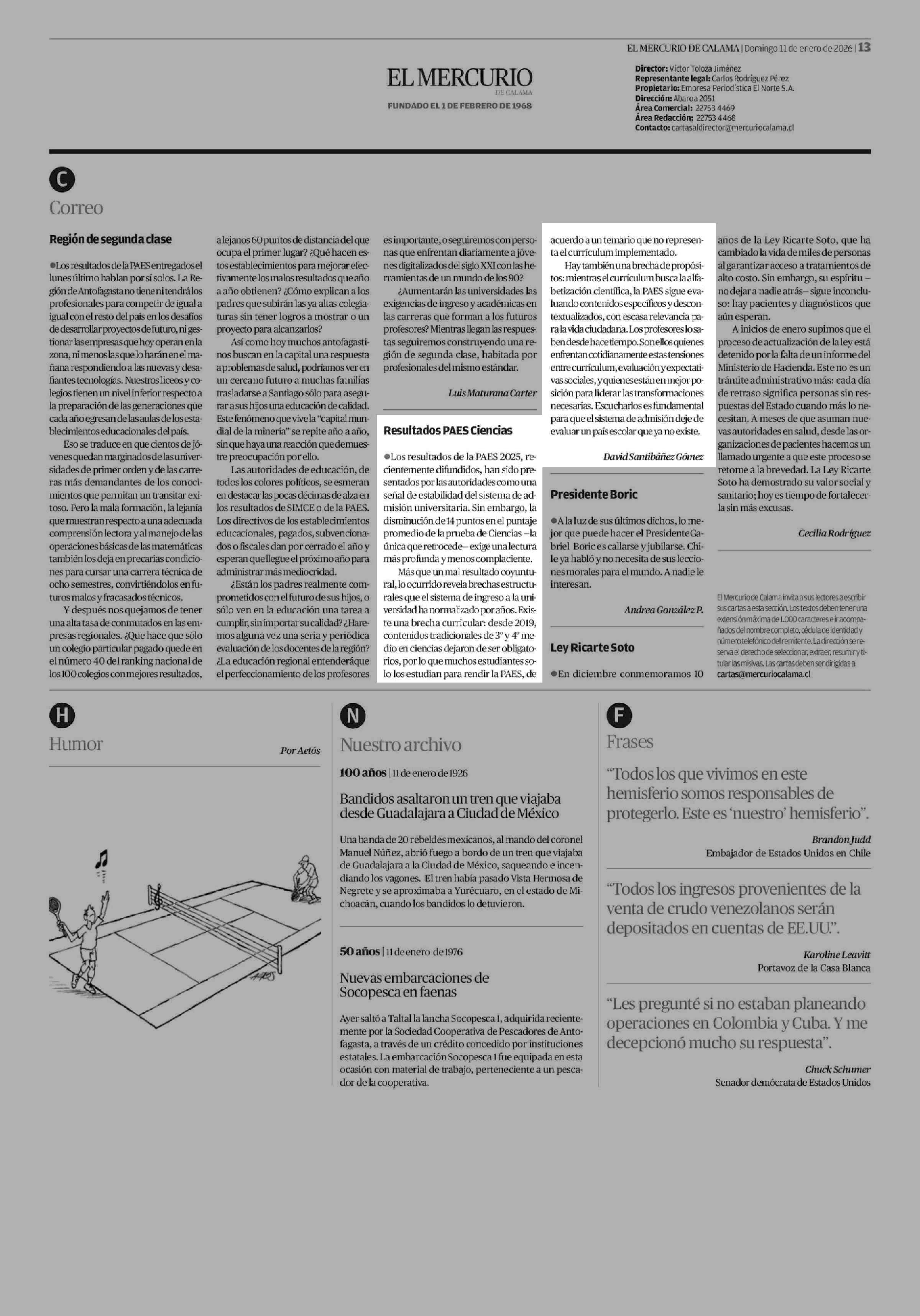 Cartas: Resultados PAES Ciencias 11-01-2026 El Mercurio de Calama |