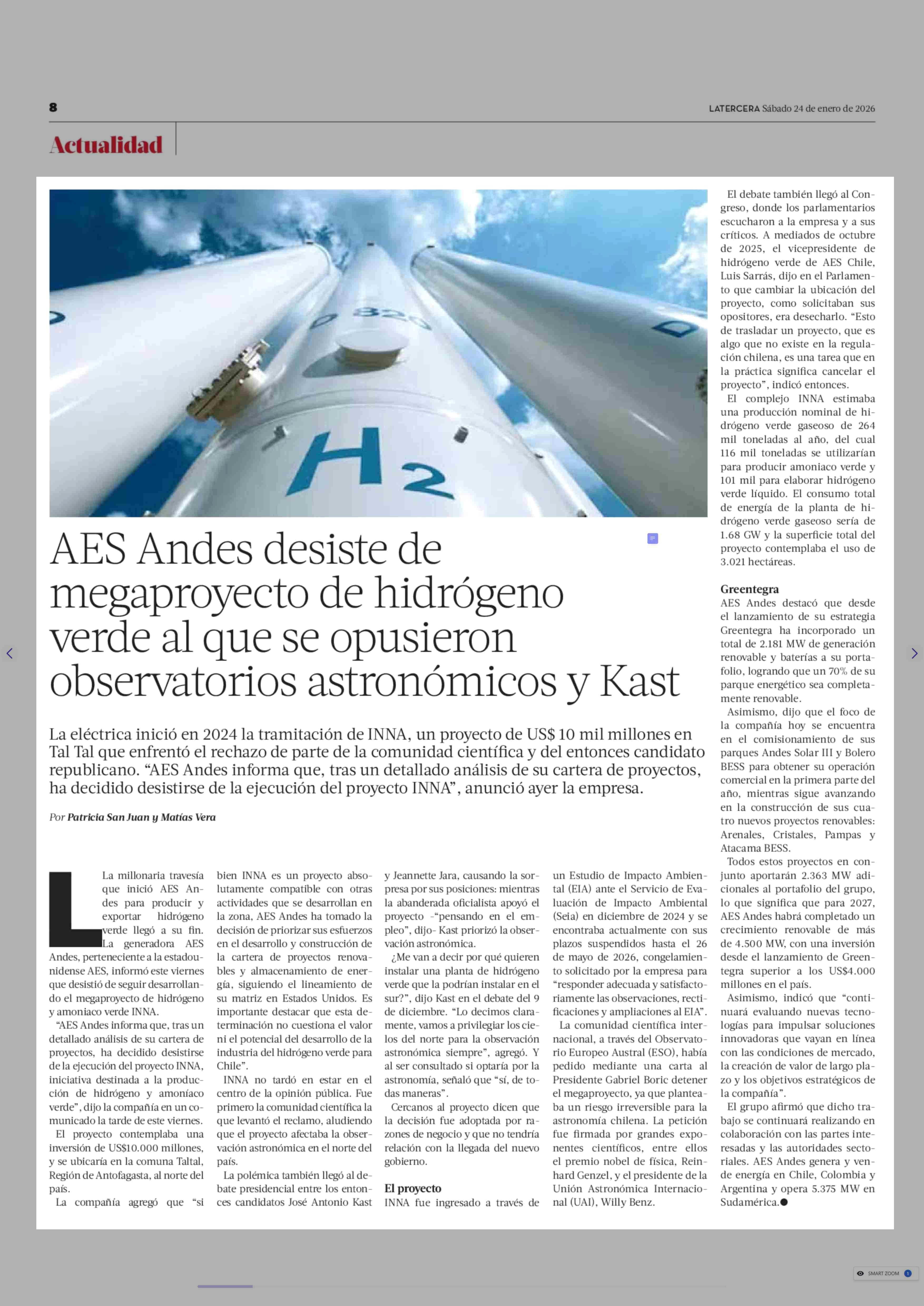 AES Andes desiste de megaproyecto de hidrógeno verde al que se opusieron observatorios astronómicos y Kast 24-01-2026 La Tercera |