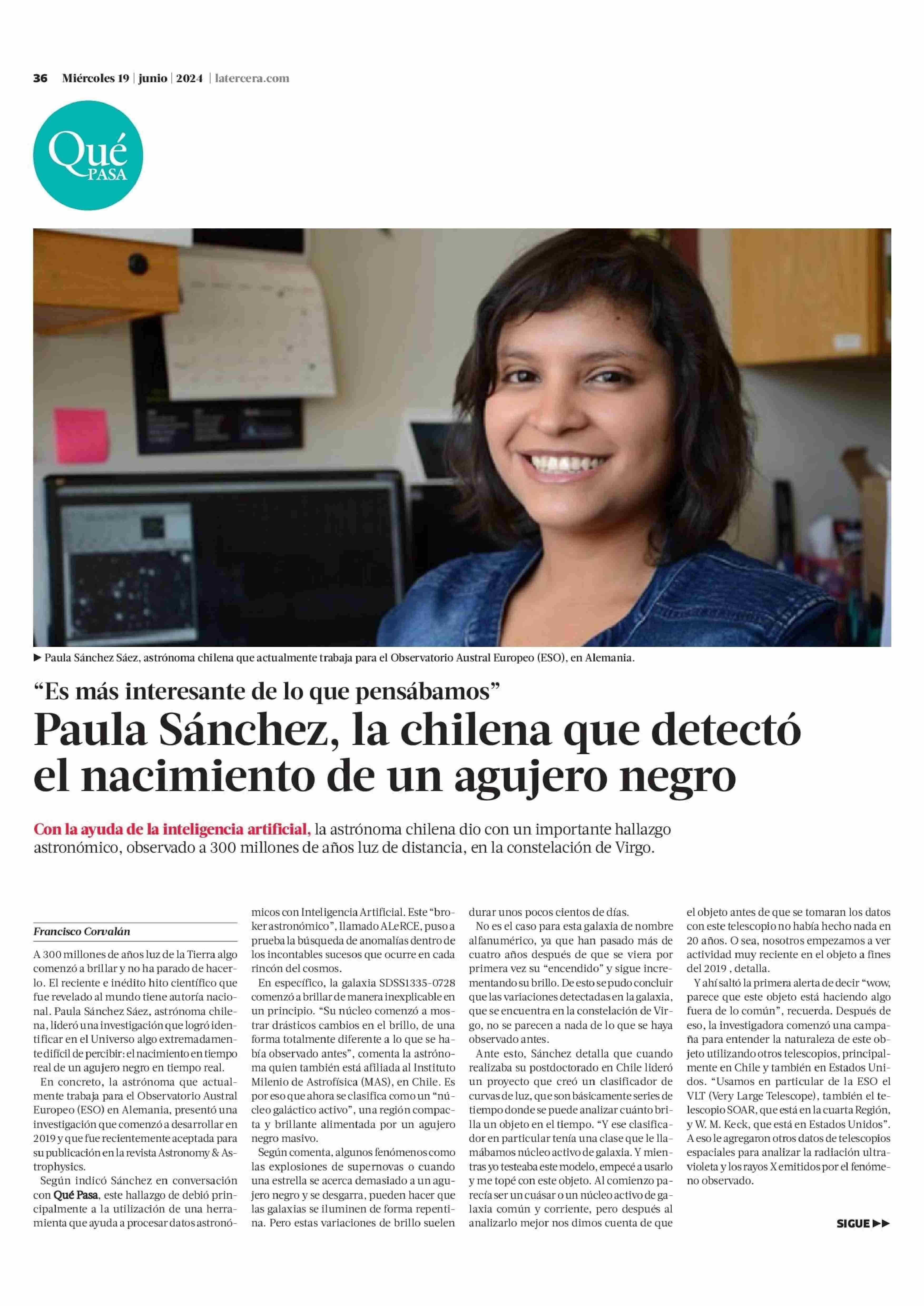 Paula Sánchez, la chilena que detectó el nacimiento de un agujero negro 19-06-2024 La Tercera |