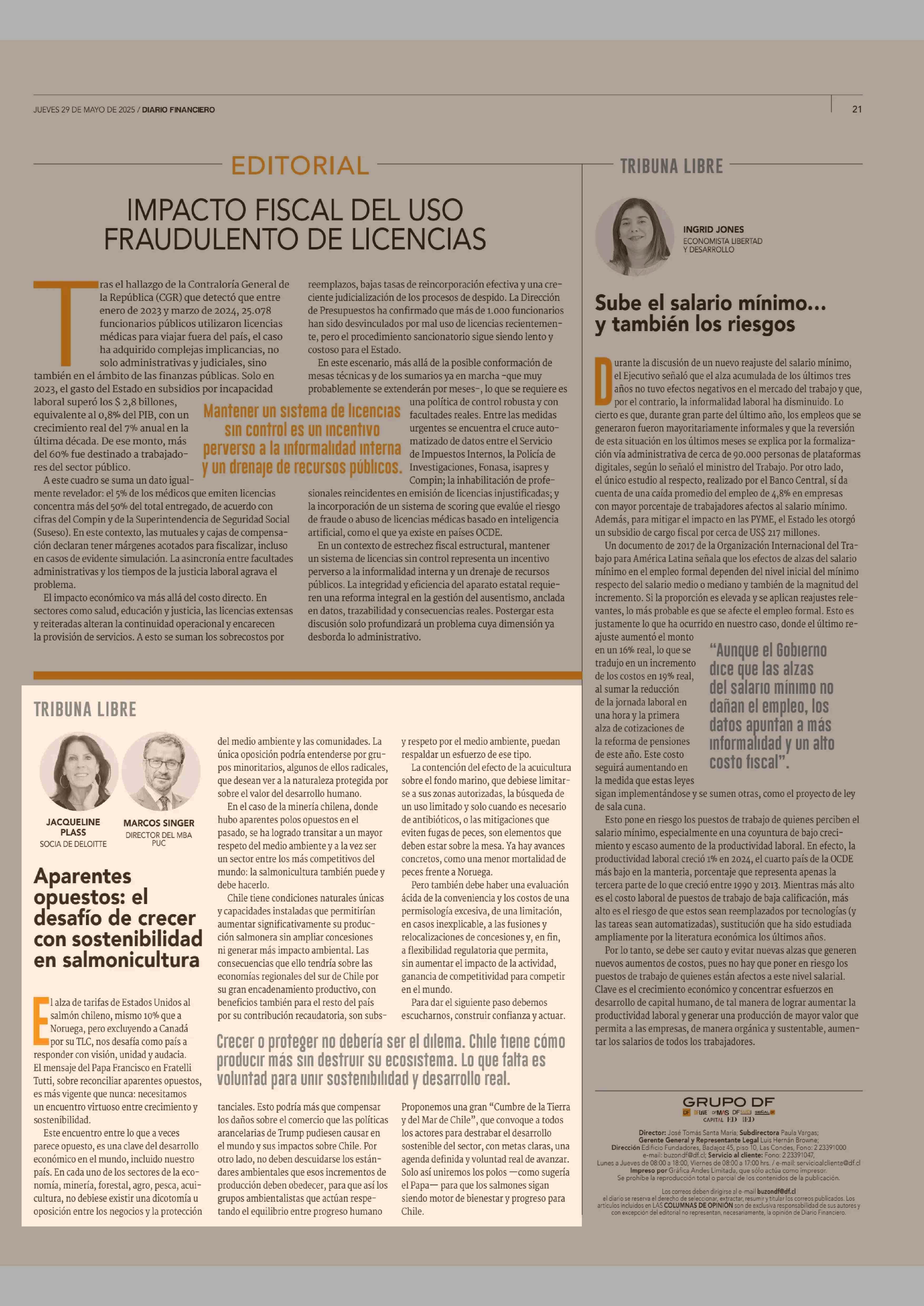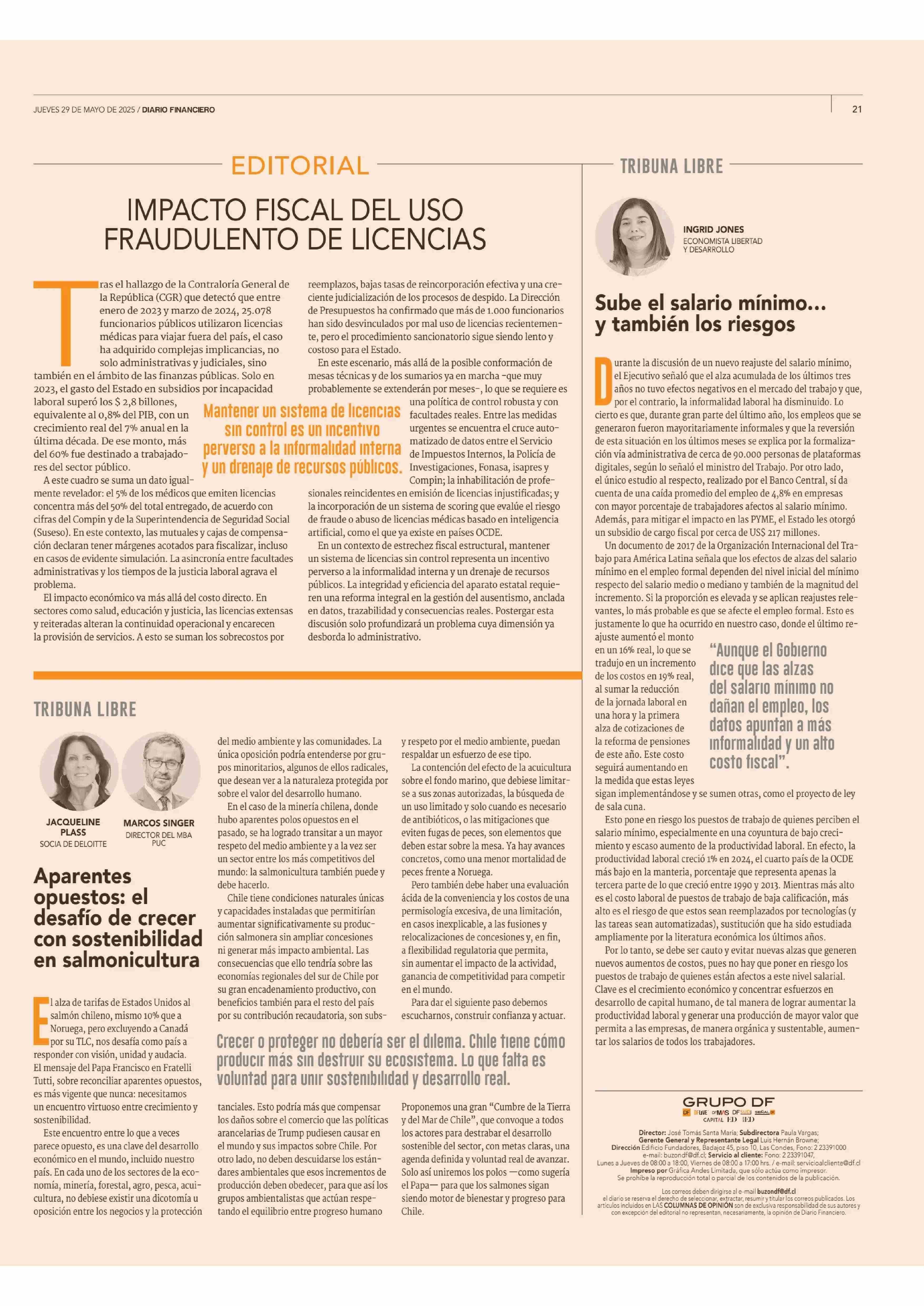COLUMNAS DE OPINIÓN: Aparentes opuestos: el desafío de crecer con sostenibilidad en salmonicultura 29-05-2025 Diario Financiero |