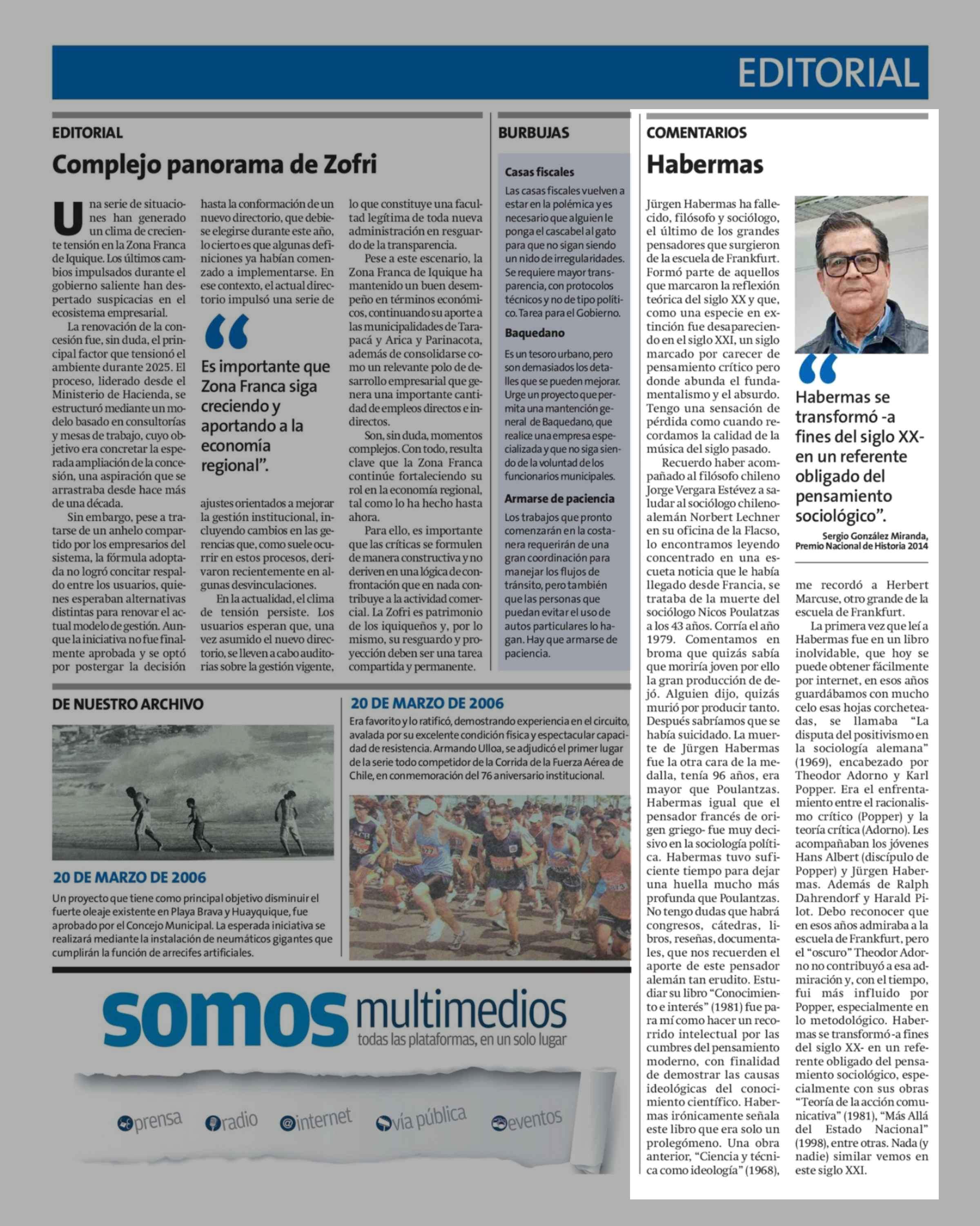 Columnas de Opinión: Habermas 20-03-2026 La Estrella de Iquique |