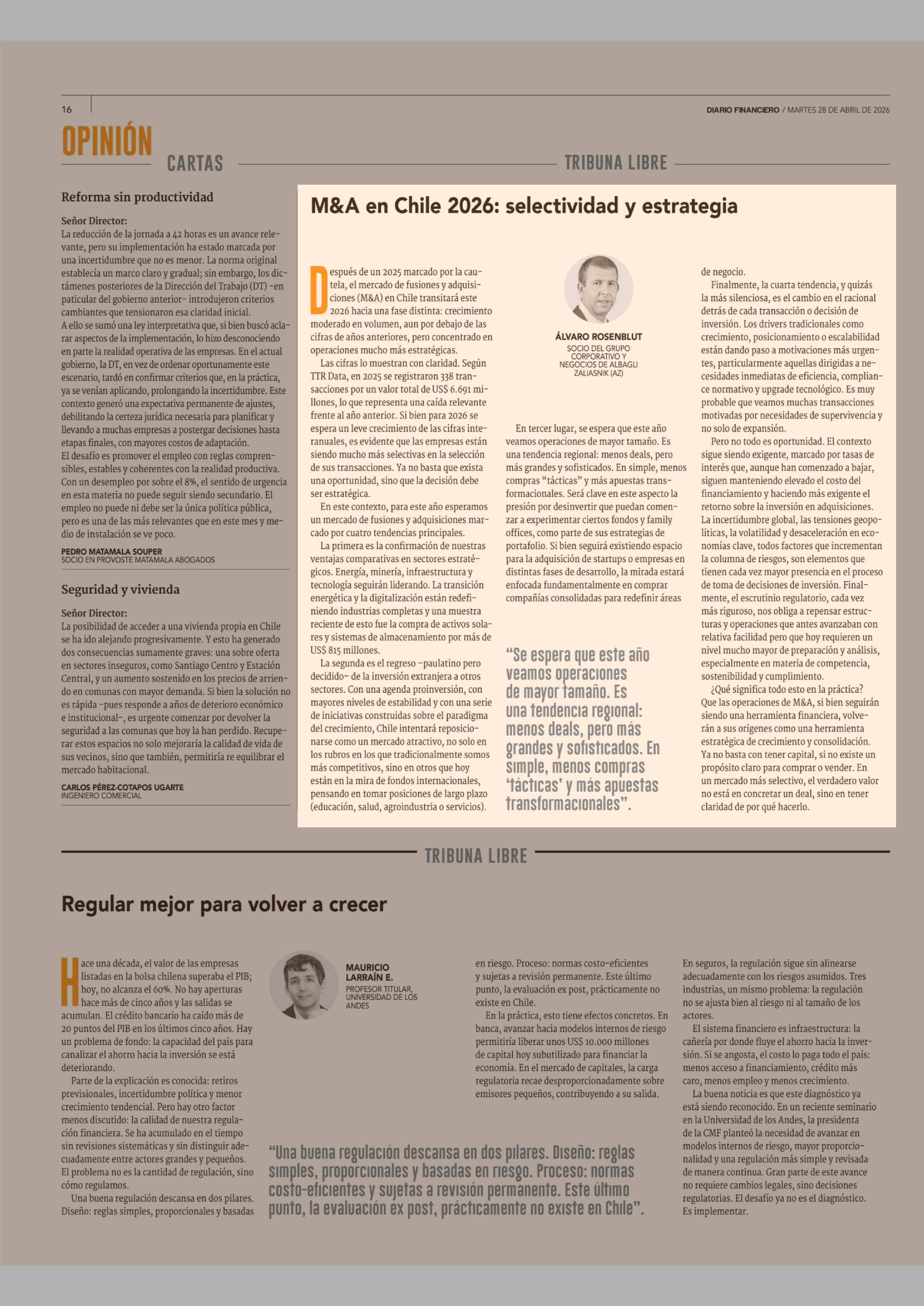 Columnas de Opinión: M&A en Chile 2026: selectividad y estrategia 28-04-2026 Diario Financiero |