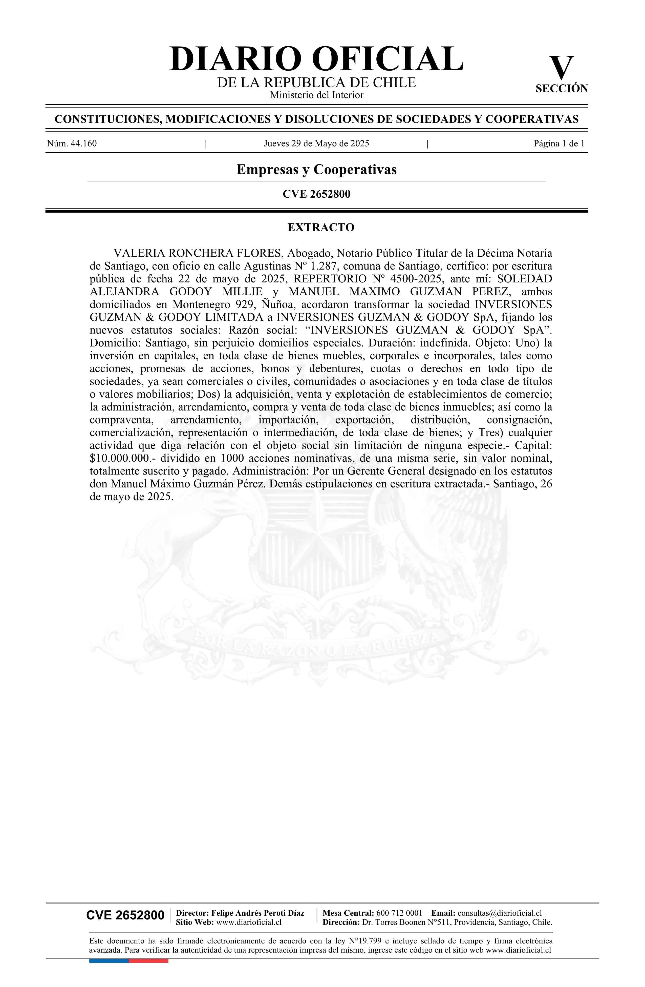 Inversiones Guzmán & Godoy Limitada 76.309.624-6* 29-05-2025 Diario Oficial Edición Electrónica |