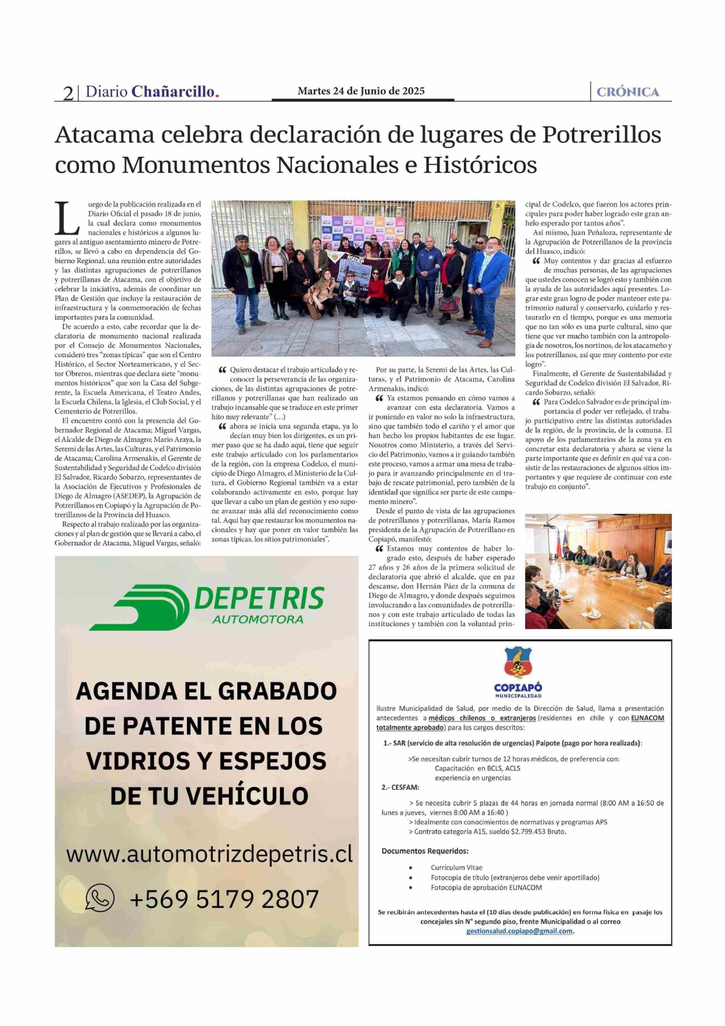 Atacama celebra declaración de lugares de Potrerillos como Monumentos Nacionales e Históricos 24-06-2025 Diario Chañarcillo |