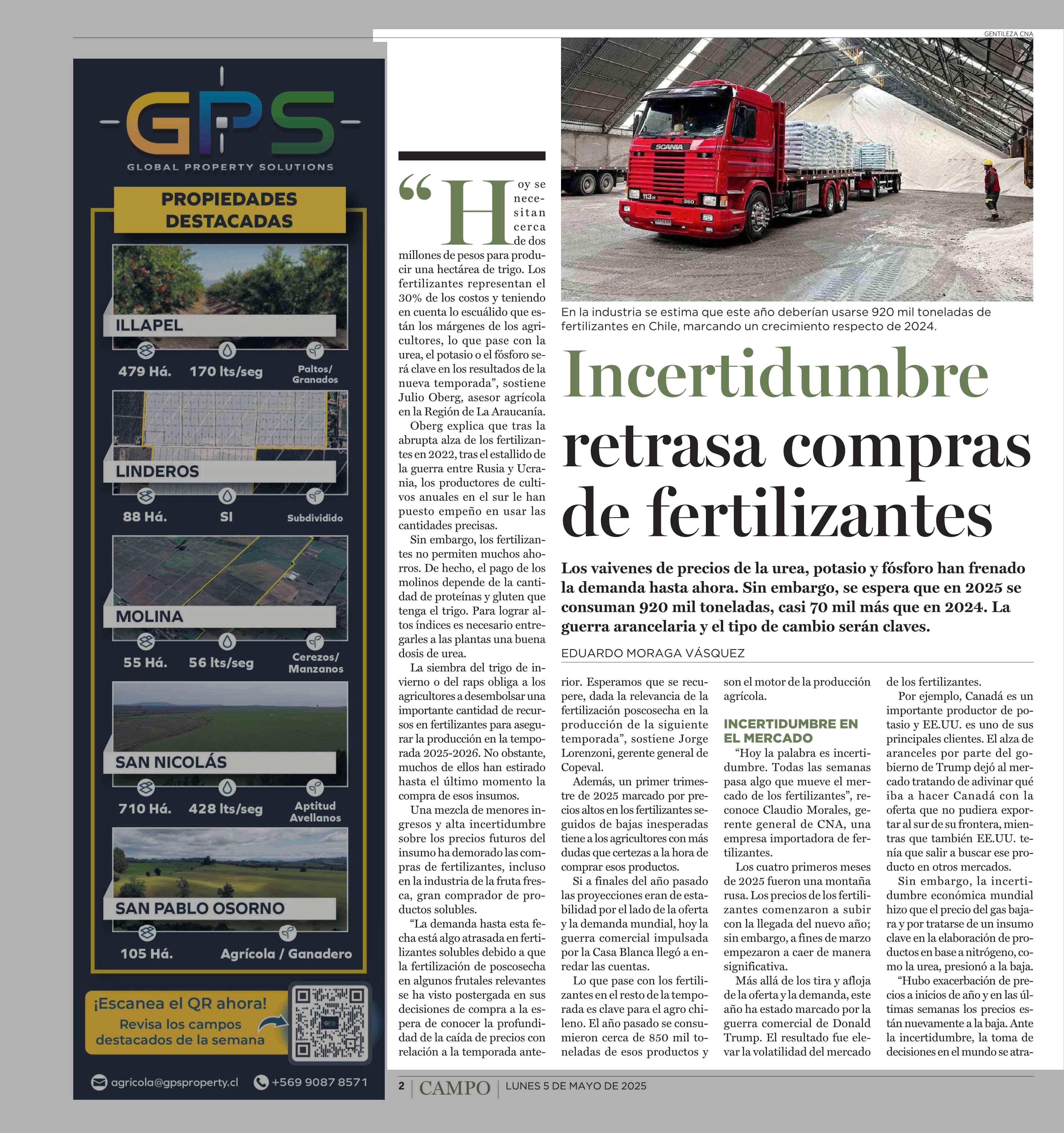 Incertidumbre retrasa compras de fertilizantes 05-05-2025 El Mercurio |