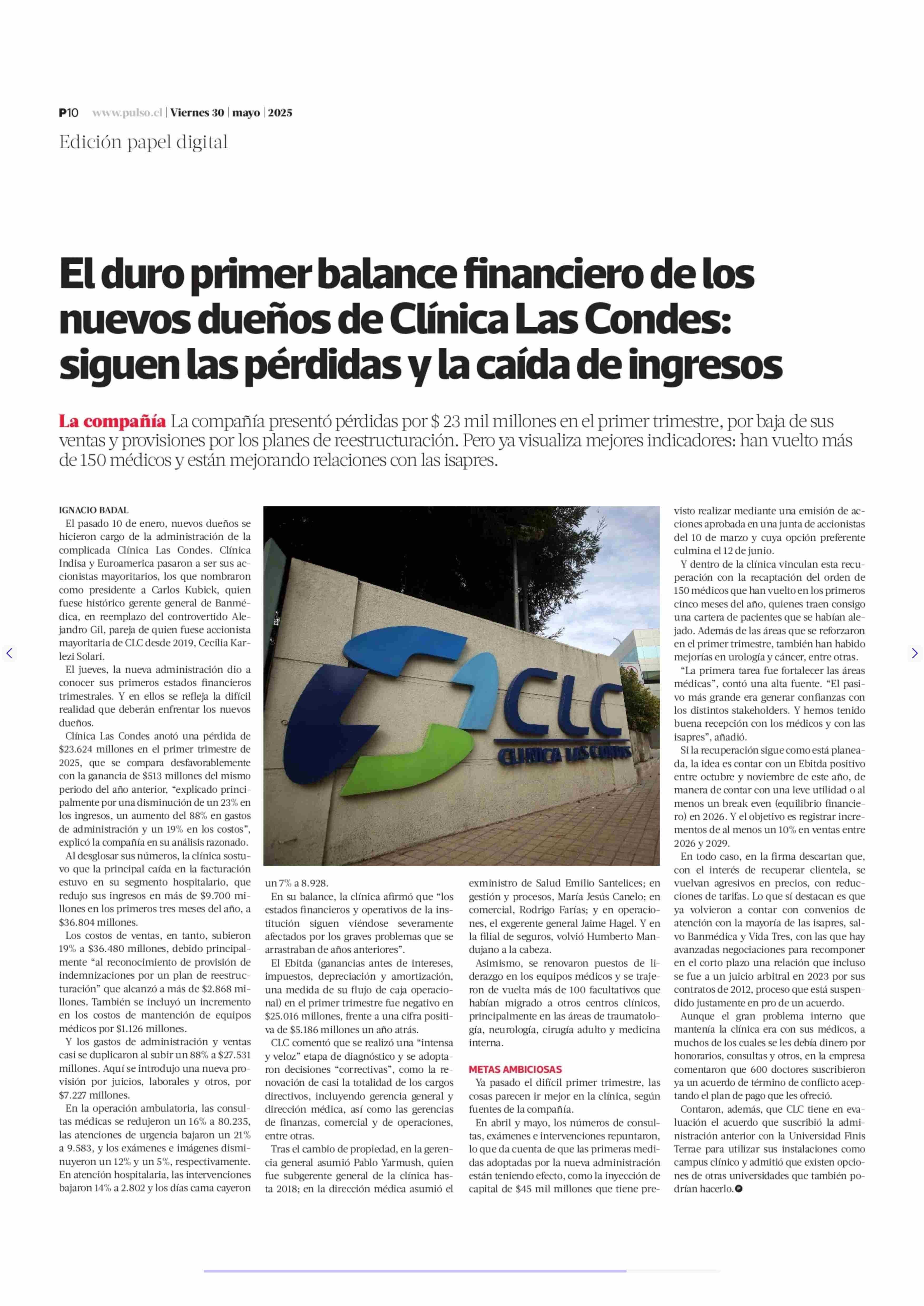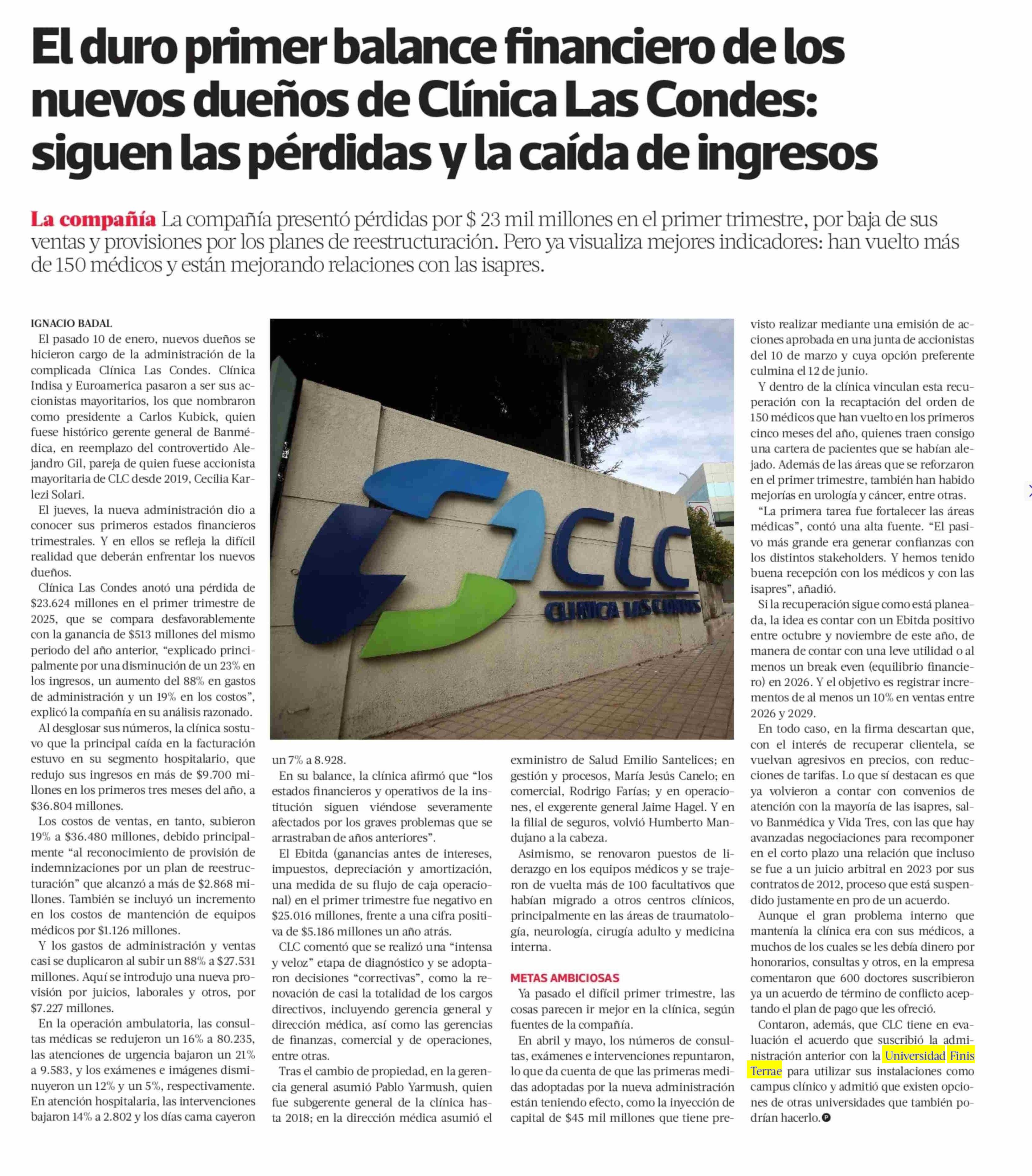 Título: El duro primer balance financiero de los nuevos dueños de Clínica Las Condes: siguen las pérdidas y la caída de ingresos