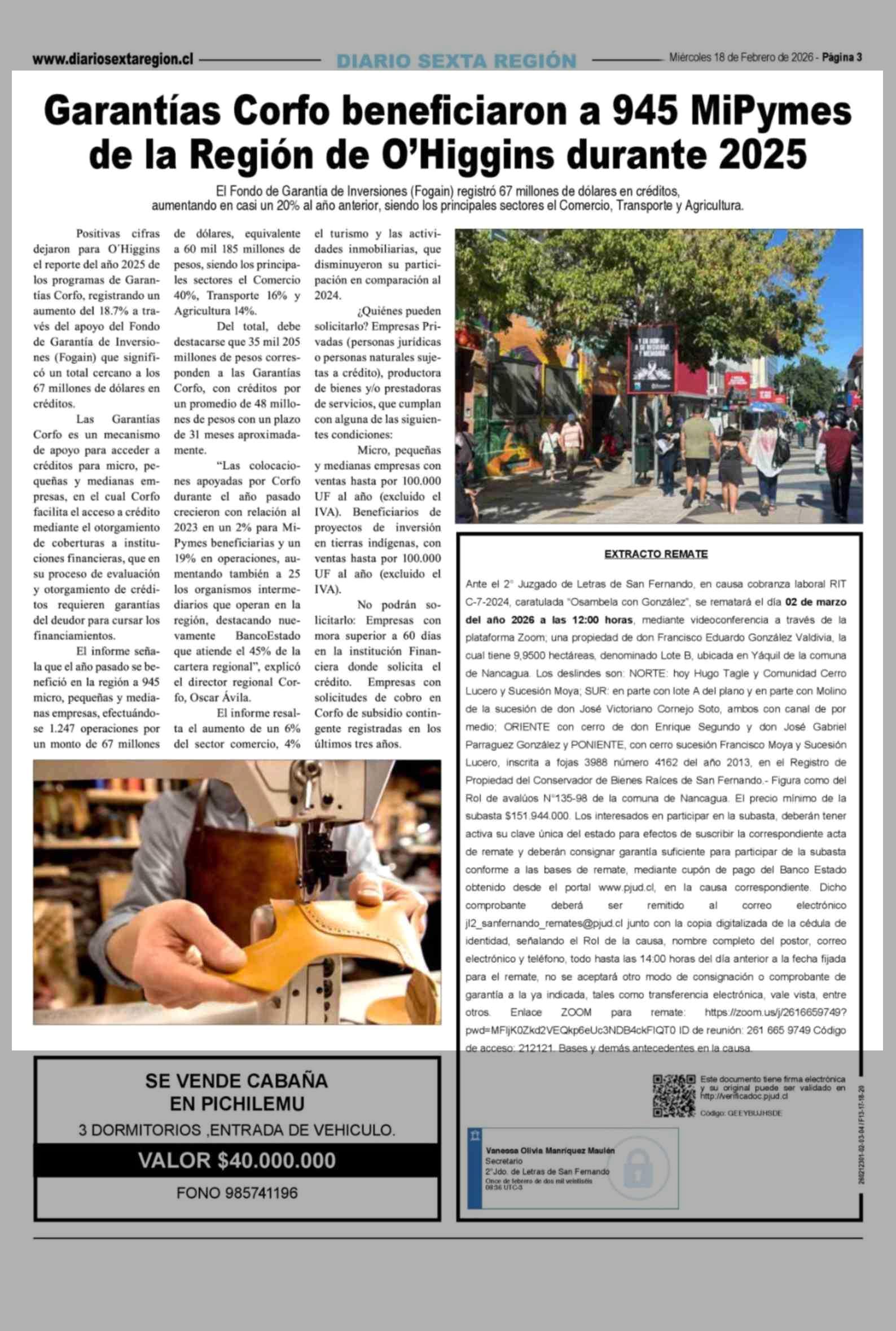 Fecha: 18-02-2026 Sector: Noticia general Región: Región del Libertador General Bernardo O'Higgins