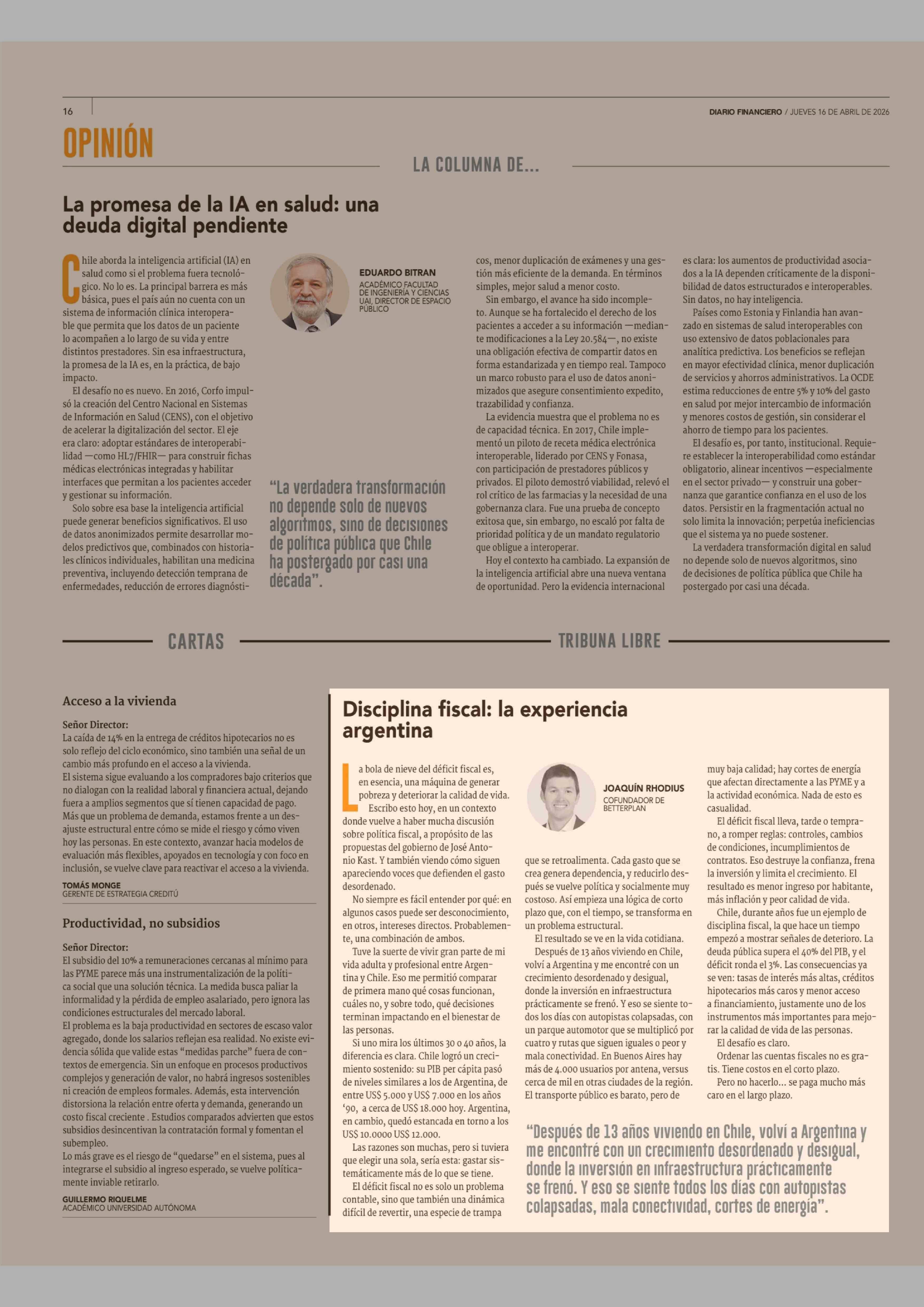 Columnas de Opinión: Disciplina fiscal: la experiencia argentina 16-04-2026 Diario Financiero |