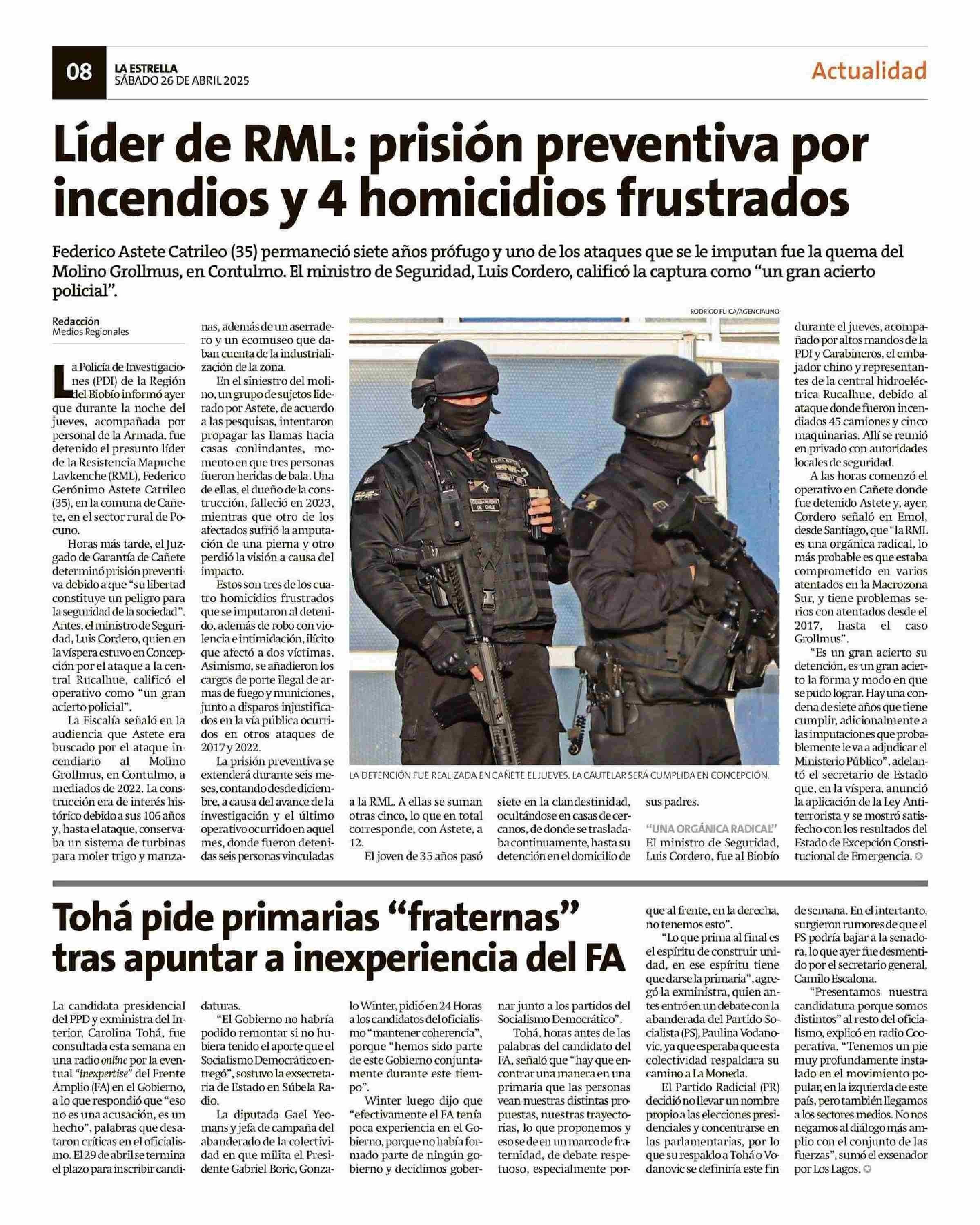 Lider de RML: prisión preventiva por incendios y 4 homicidios frustrados 26-04-2025 La Estrella de Chiloé |