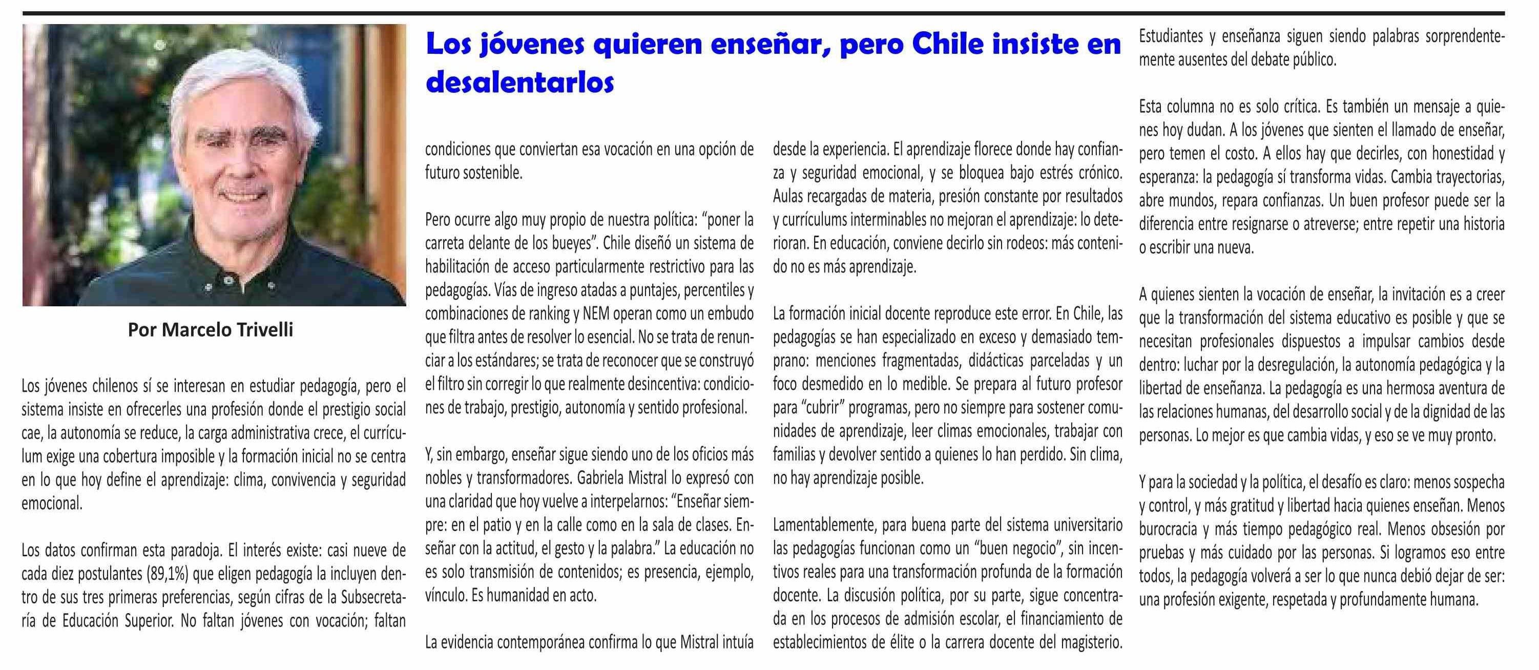 Columnas de Opinión: Los jóvenes quieren enseñar, pero Chile insiste en desalentarlos 18-01-2026 El Longino |