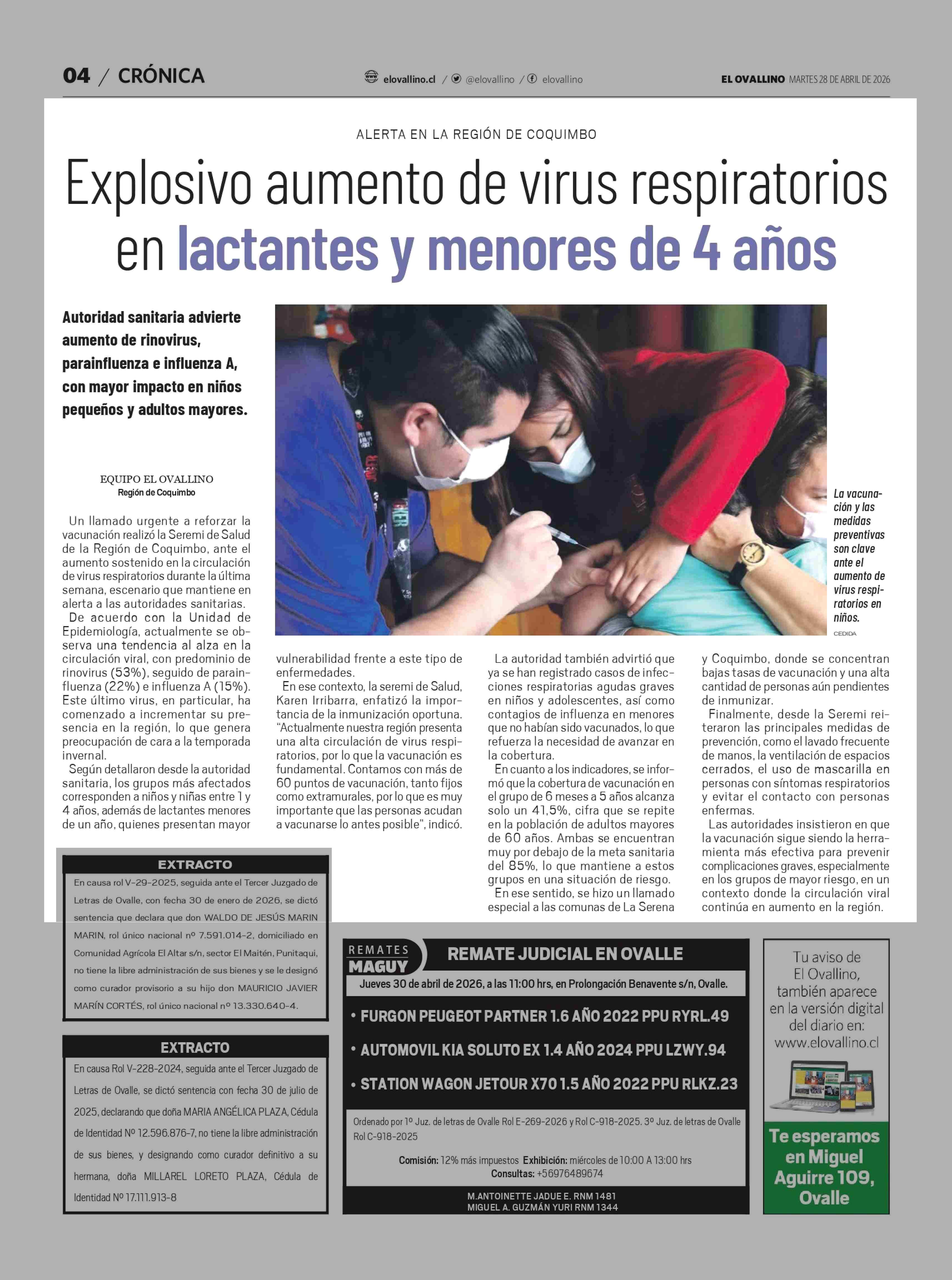 Explosivo aumento de virus respiratorios en lactantes y menores de 4 años 28-04-2026 El Ovallino |