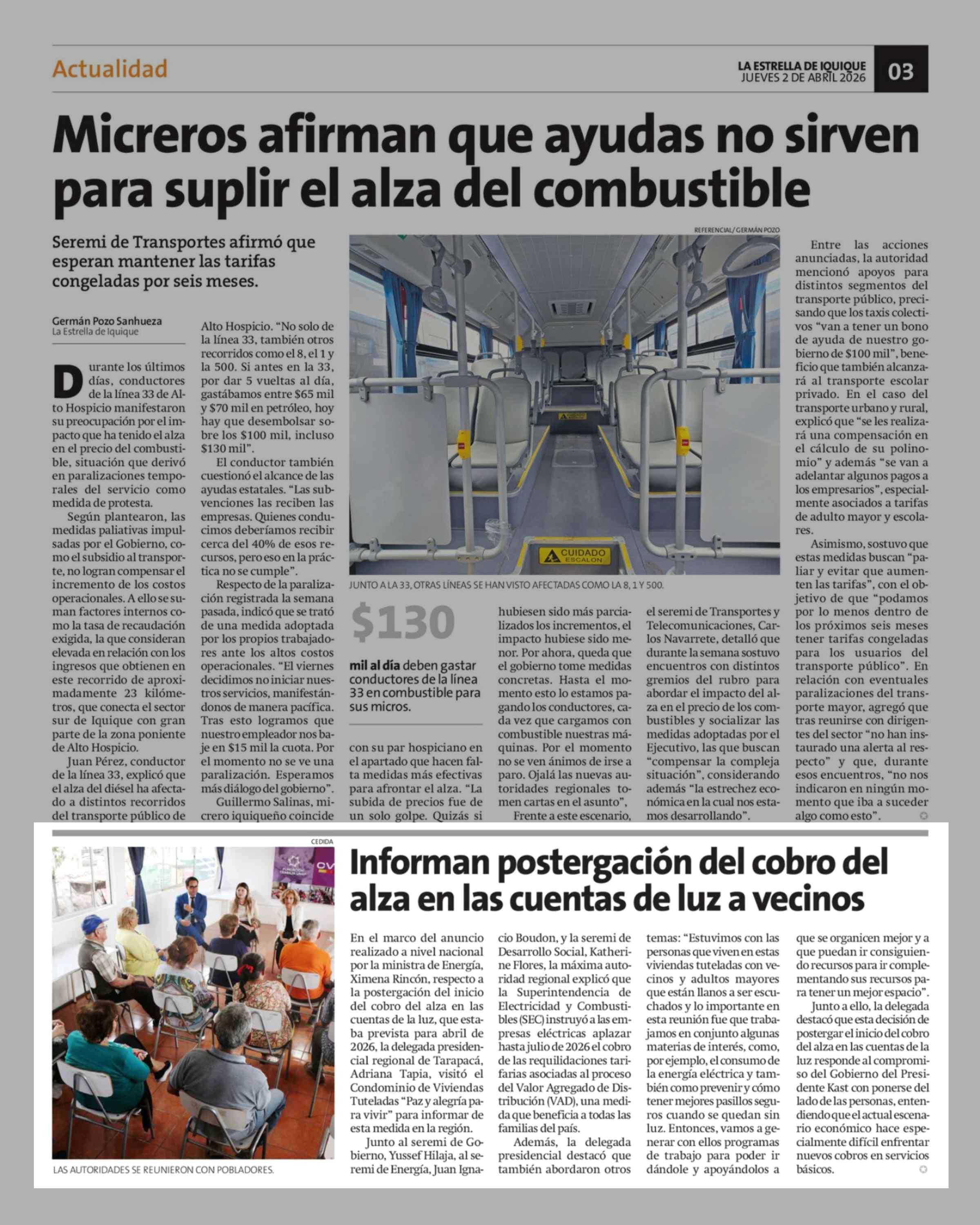 Informan postergación del cobro del alza en las cuentas de luz a vecinos 02-04-2026 La Estrella de Iquique |