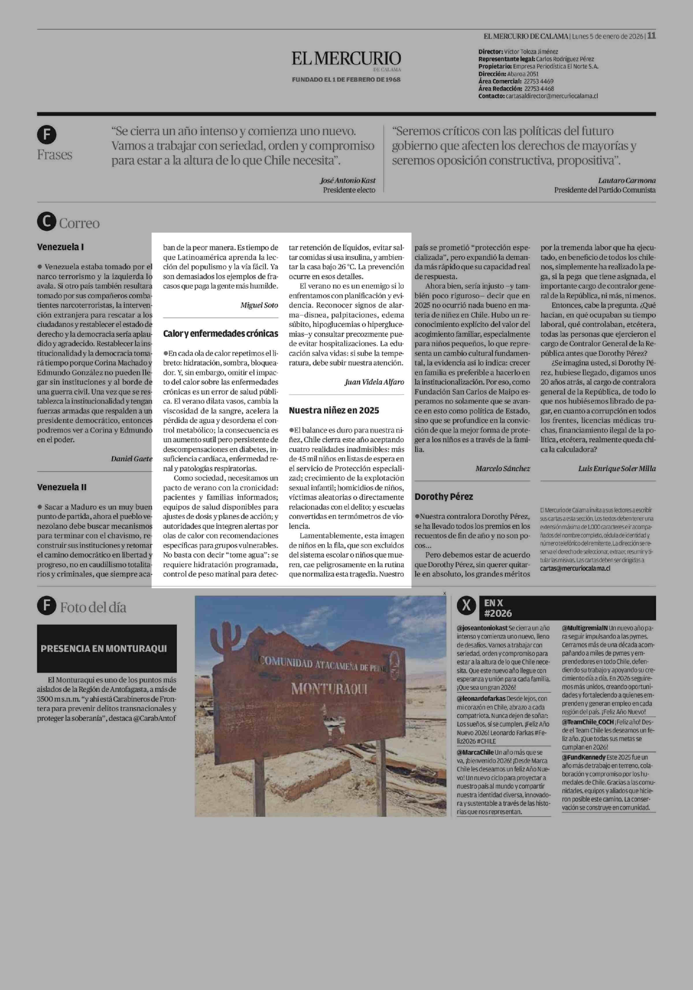 Cartas: Calor y enfermedades crónicas 05-01-2026 El Mercurio de Calama |