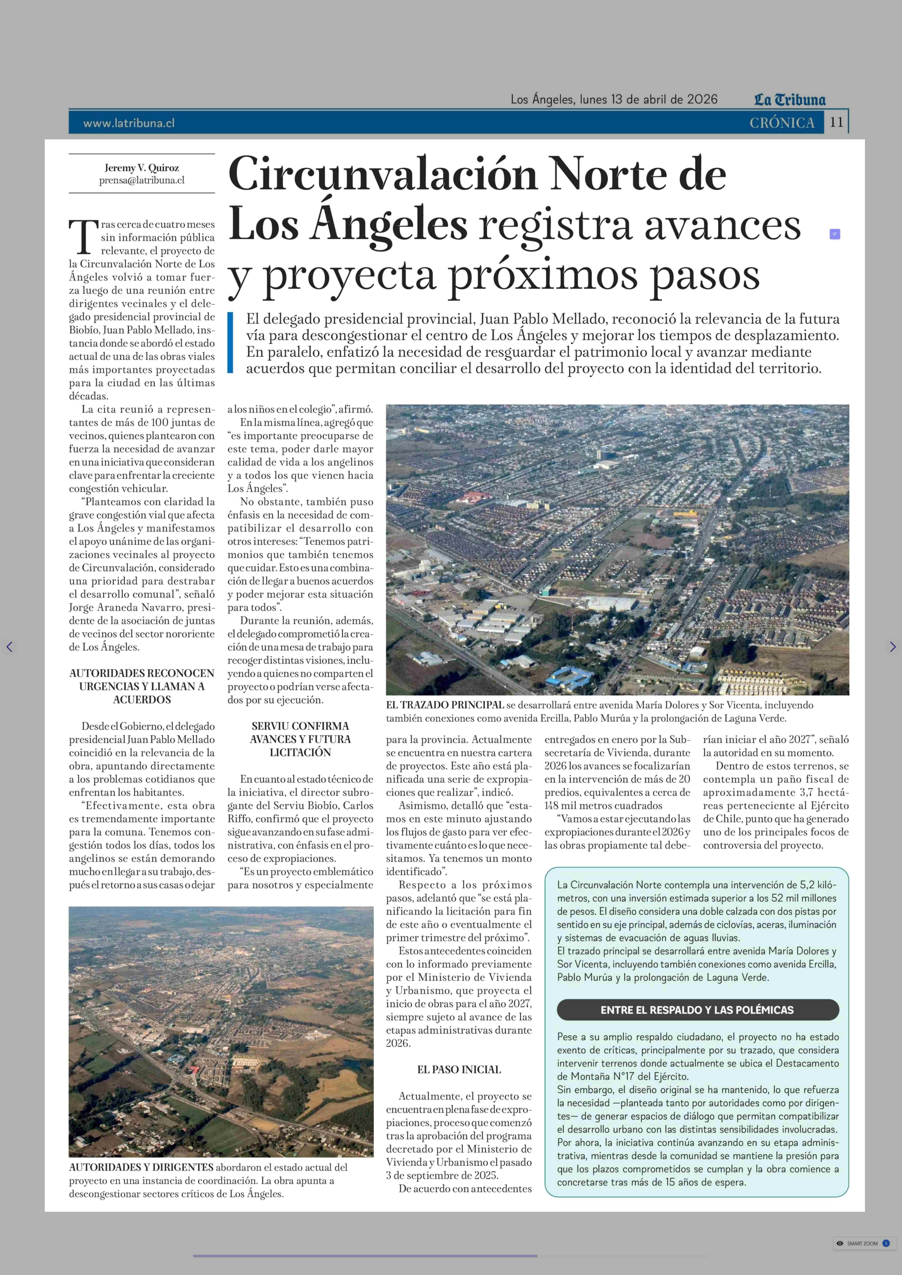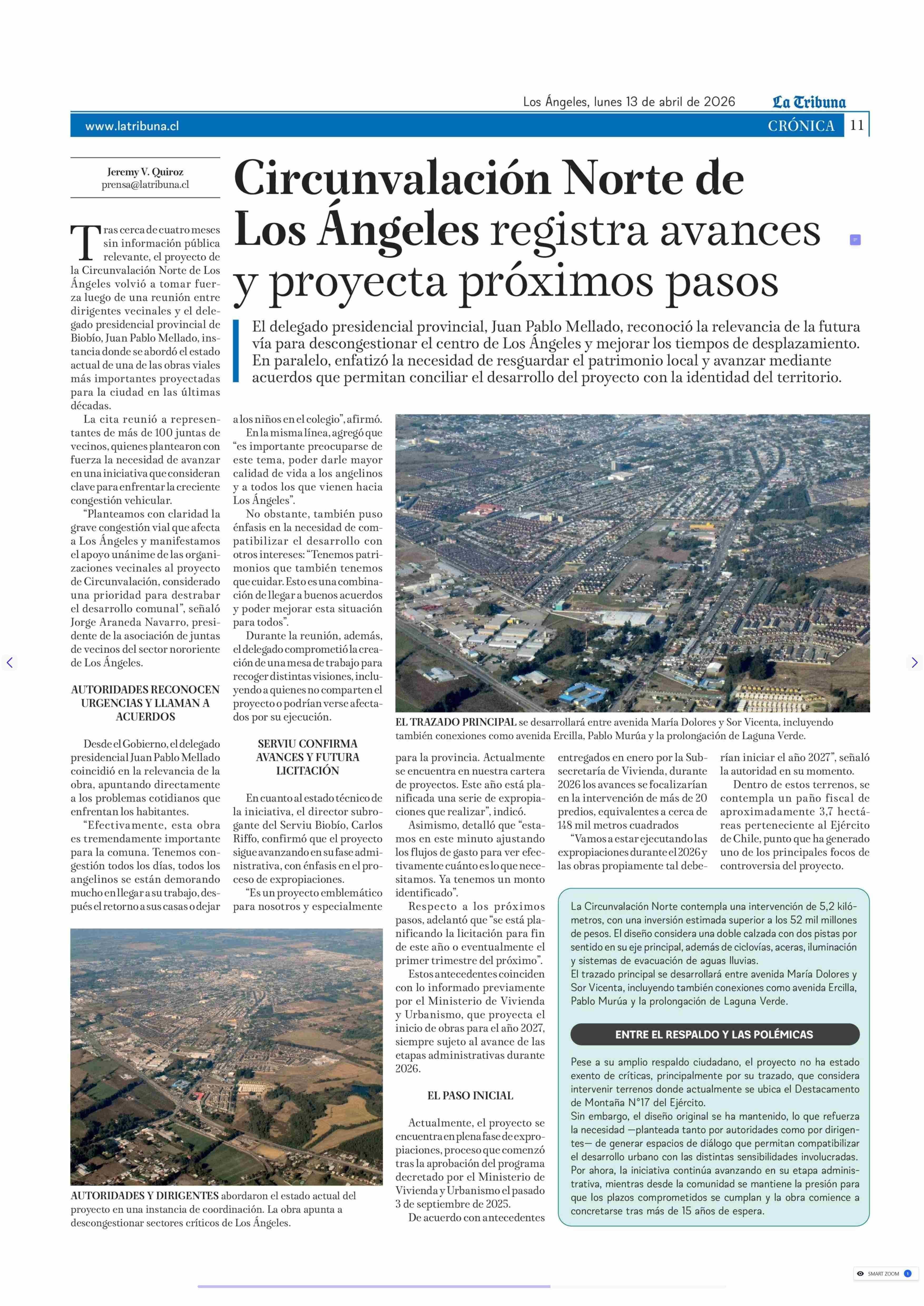 Circunvalación Norte de Los Angeles registra avances y proyecta próximos pasos 13-04-2026 La Tribuna |