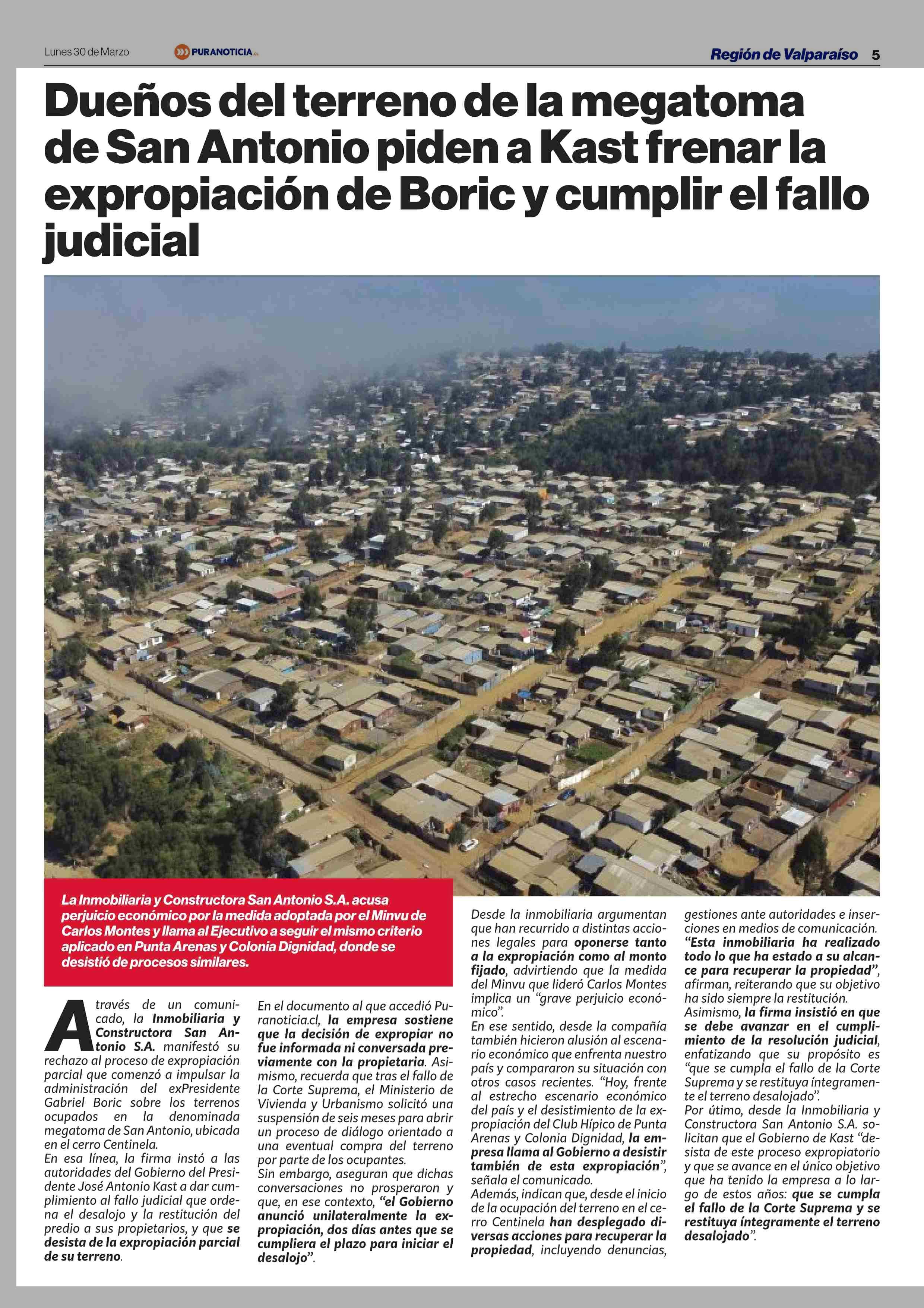 Dueños del terreno de la megatoma de San Antonio piden a Kast frenar la expropiación de Boric y cumplir el fallo judicial 30-03-2026 Puranoticia.cl |