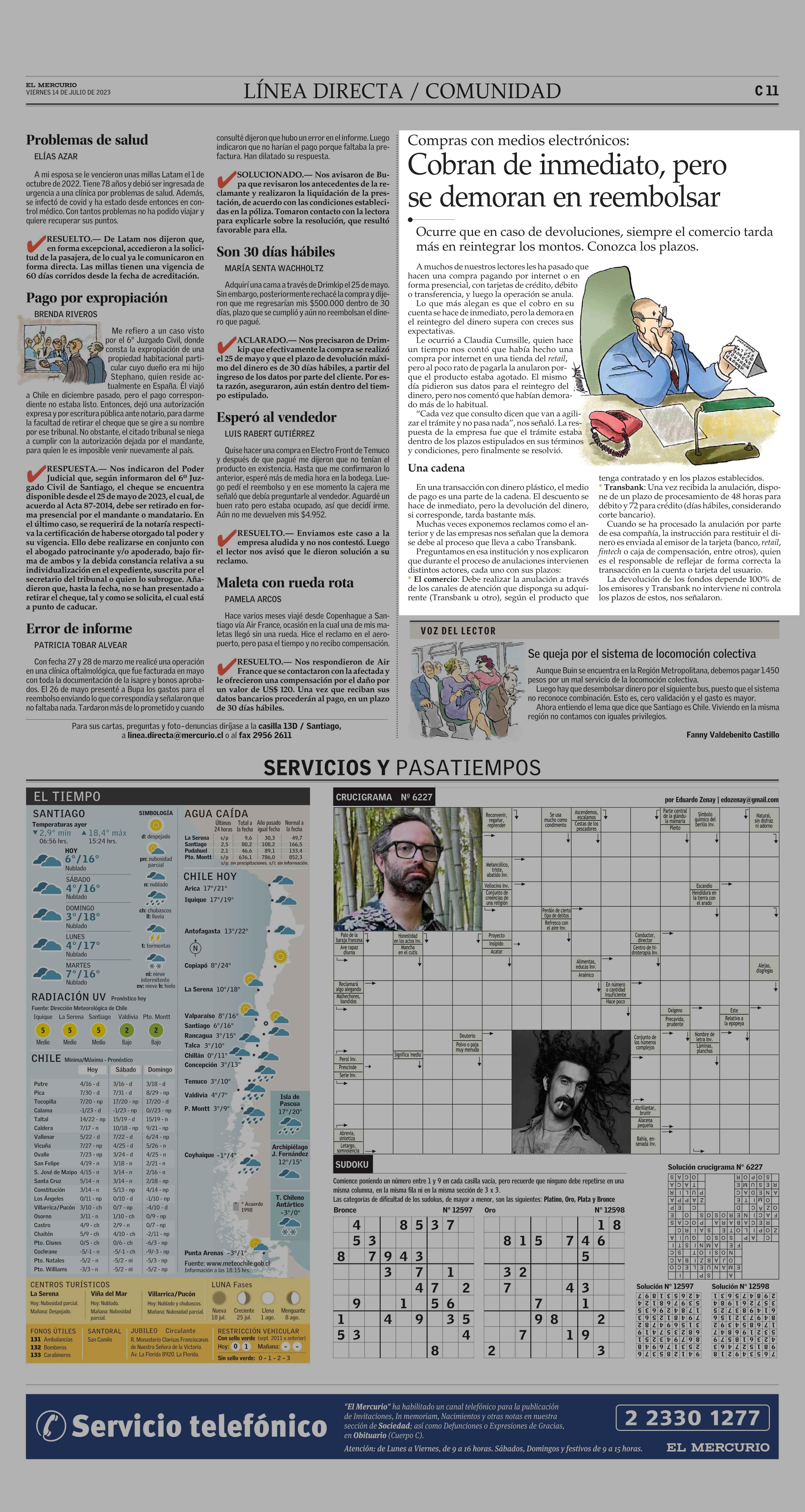 Cobran de inmediato, pero se demoran en reembolsar 14-07-2023 El Mercurio |