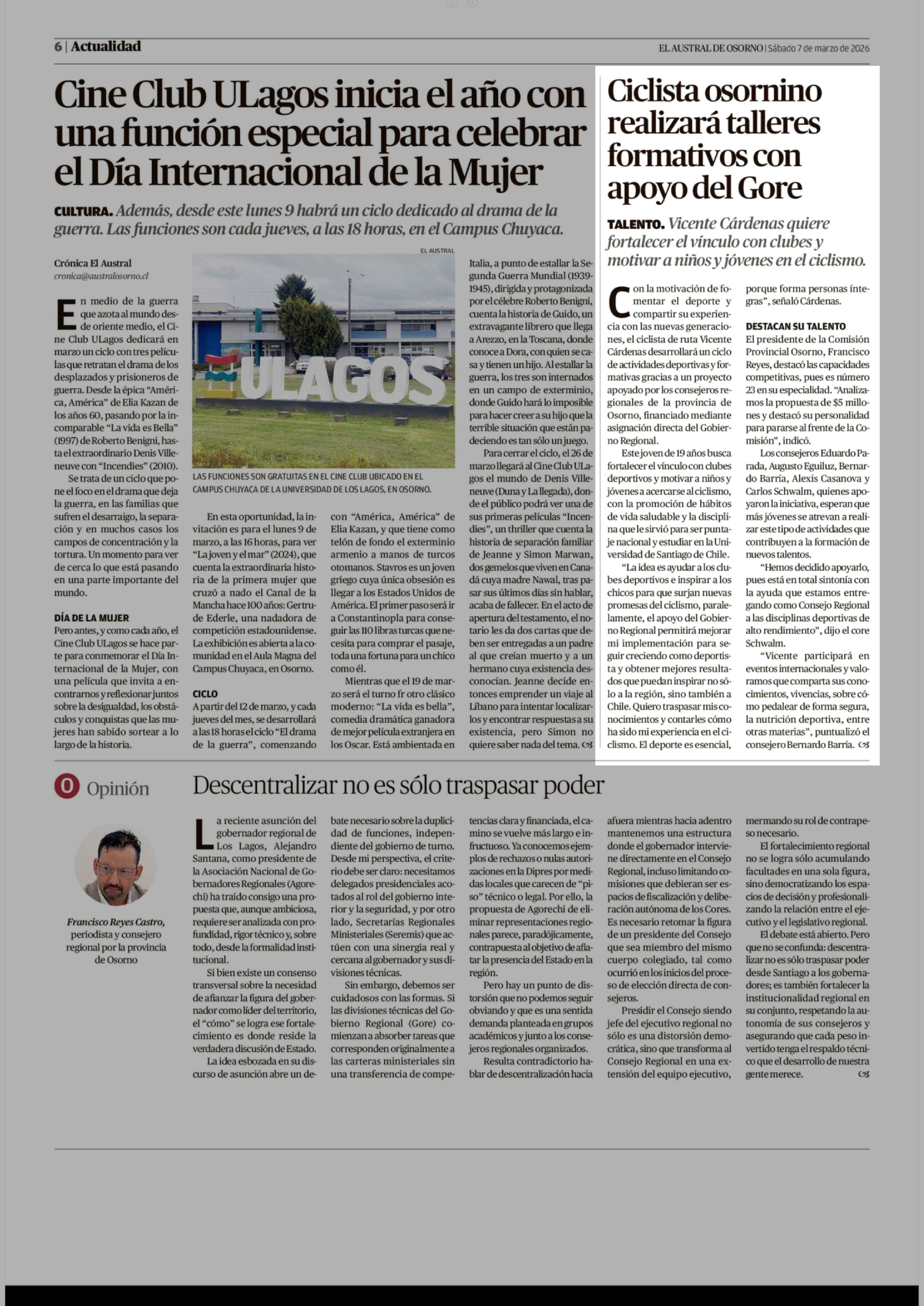 Ciclista osornino realizará talleres formativos con apoyo del Gore 07-03-2026 El Austral de Osorno |