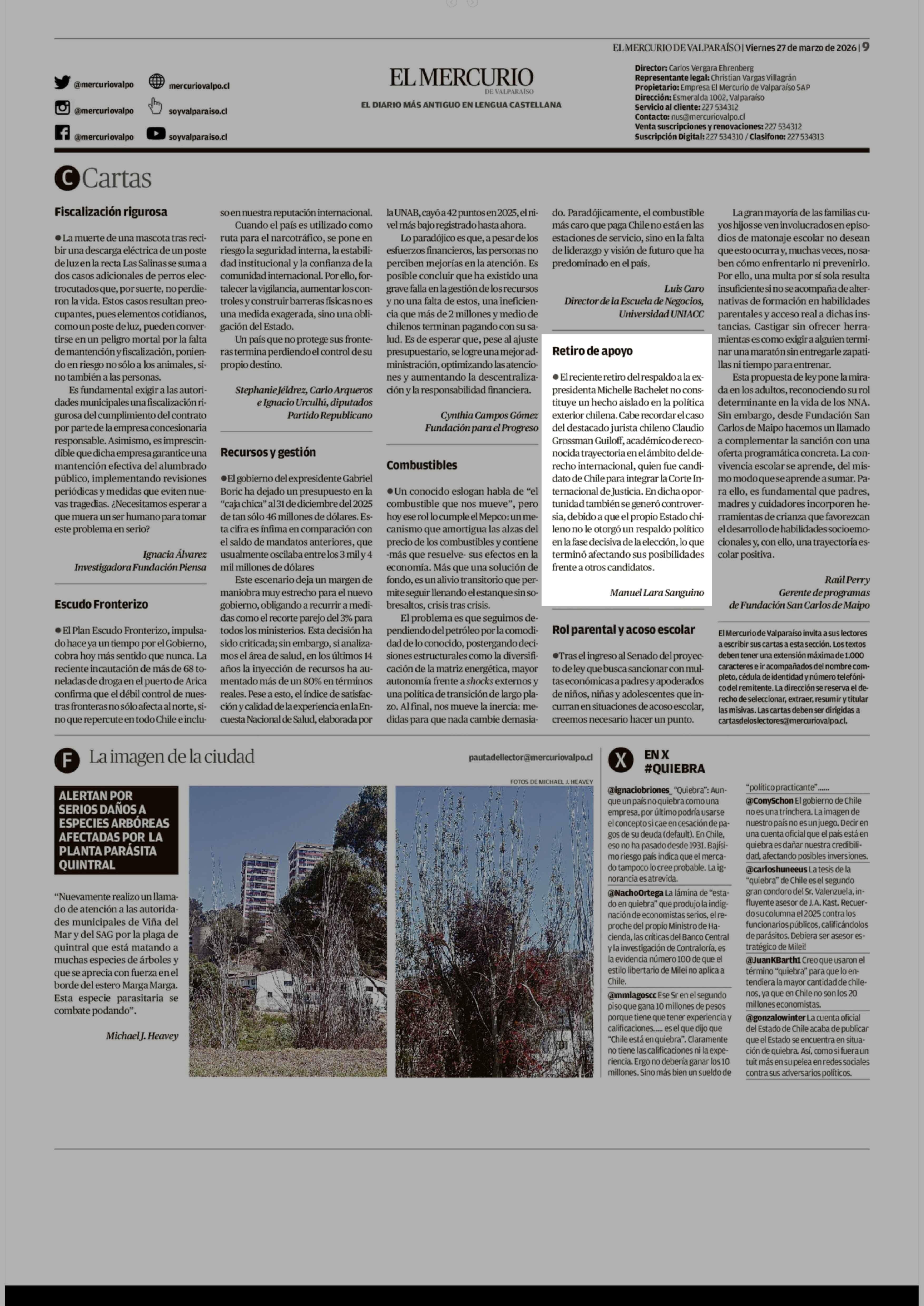 Cartas: Retiro de apoyo 27-03-2026 El Mercurio de Valparaíso |