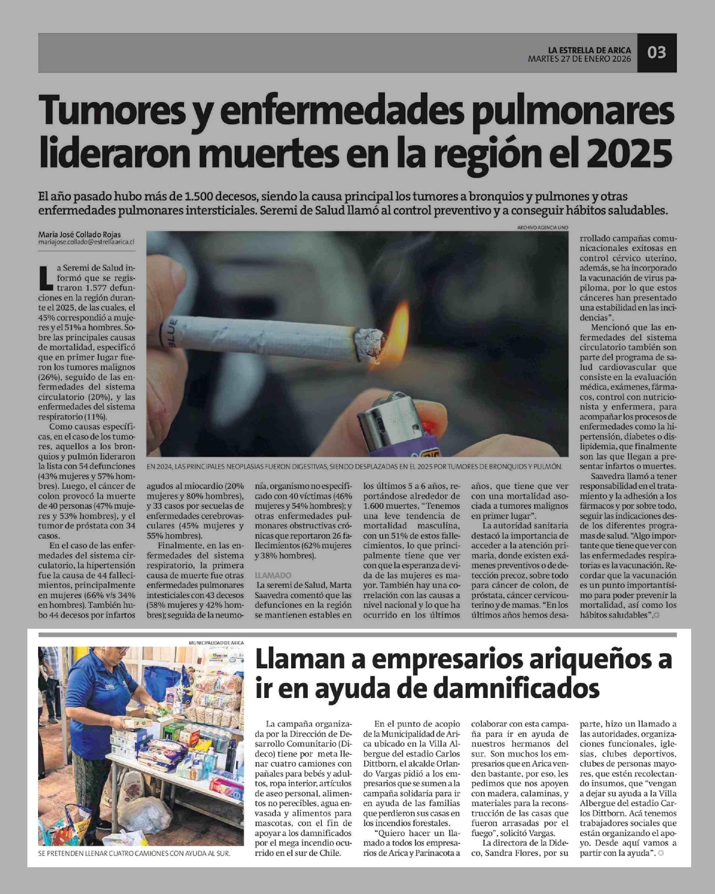 Llaman a empresarios ariqueños a ir en ayuda de damnificados 27-01-2026 La Estrella de Arica |