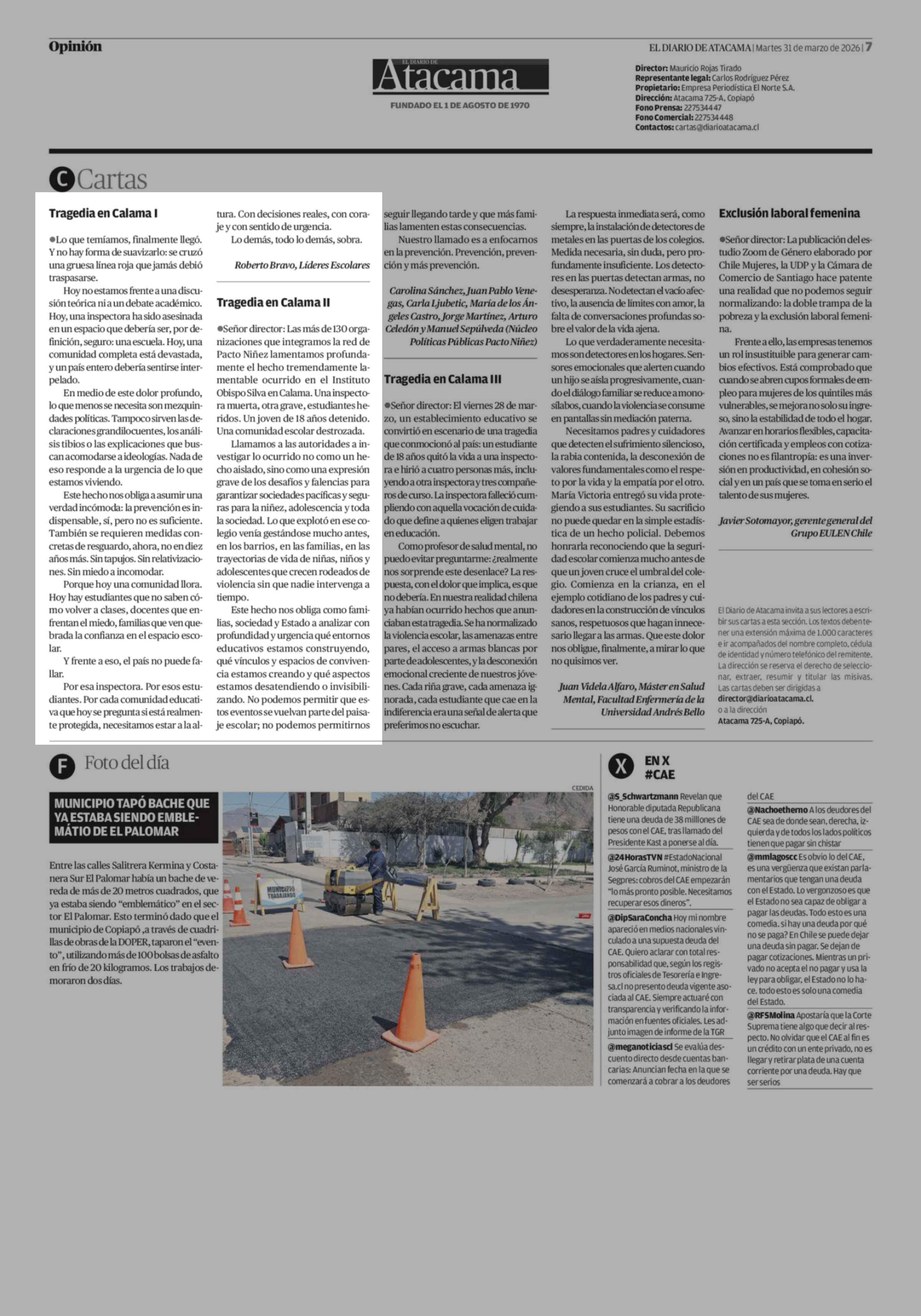 Cartas: Tragedia en Calama I 31-03-2026 El Diario de Atacama |