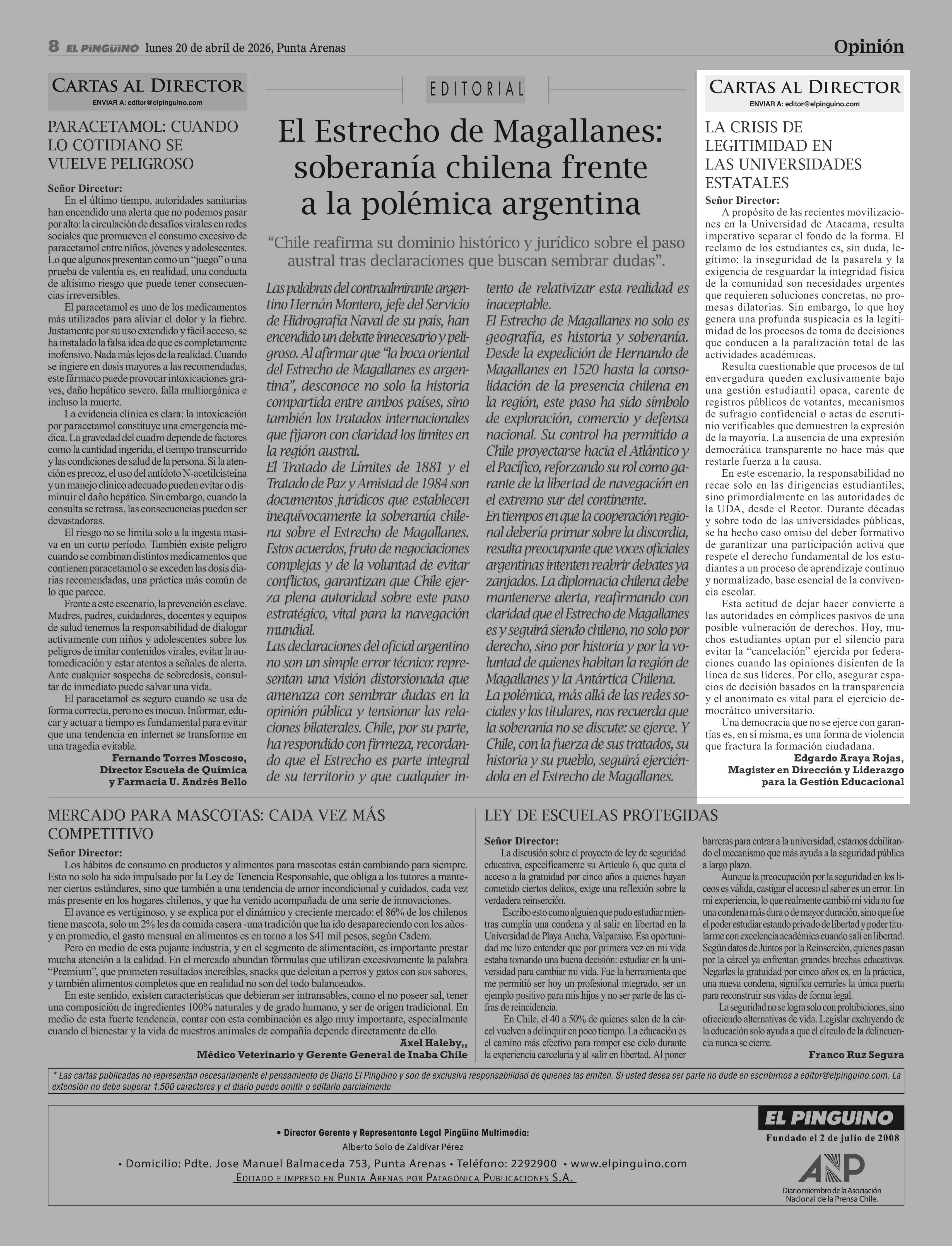 Cartas: La crisis de Legitimidad en Las Universidades estataLes 20-04-2026 El Pingüino |