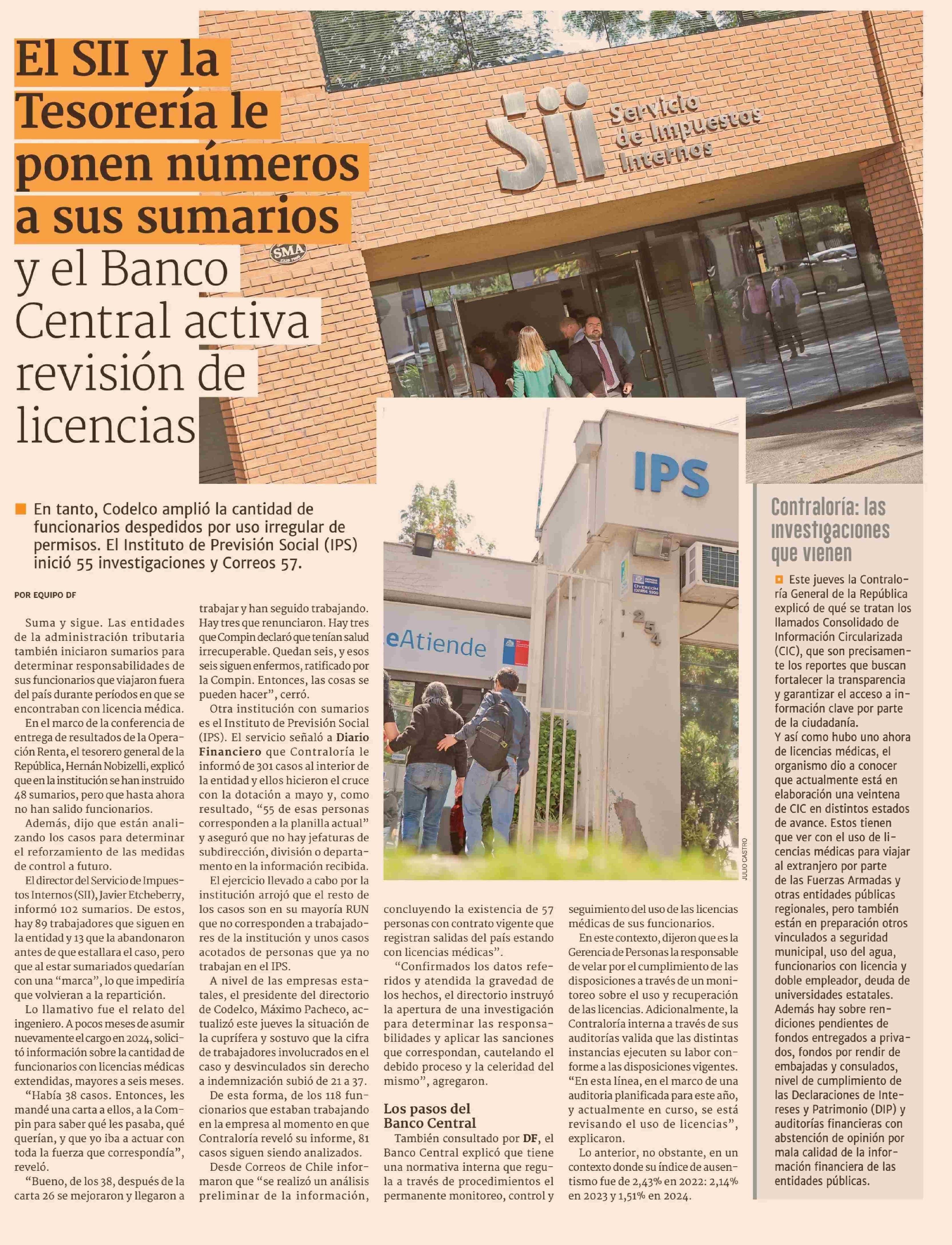 El SII y la Tesorería le ponen números a sus sumarios y el Banco Central activa revisión de licencias 30-05-2025 Diario Financiero |