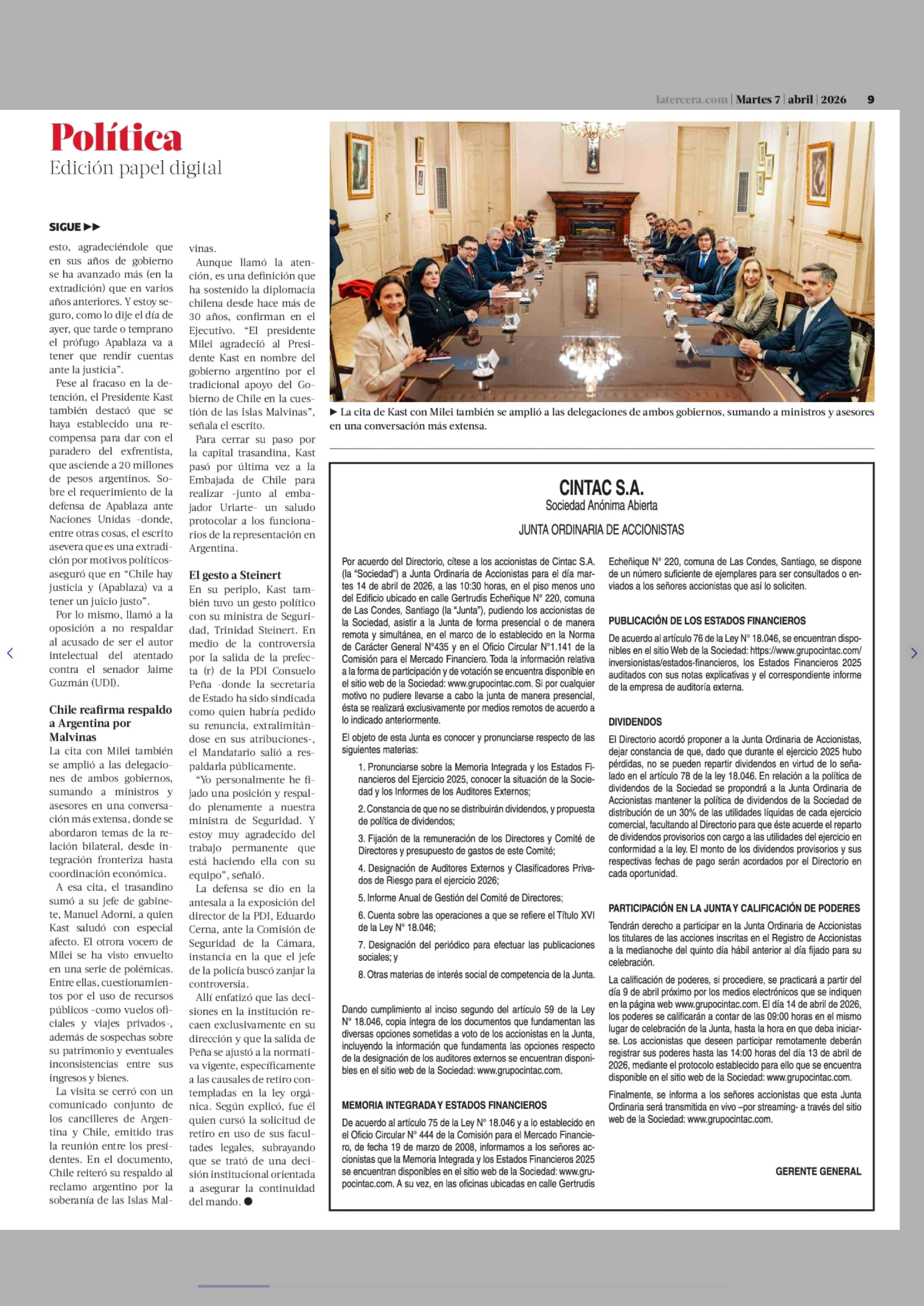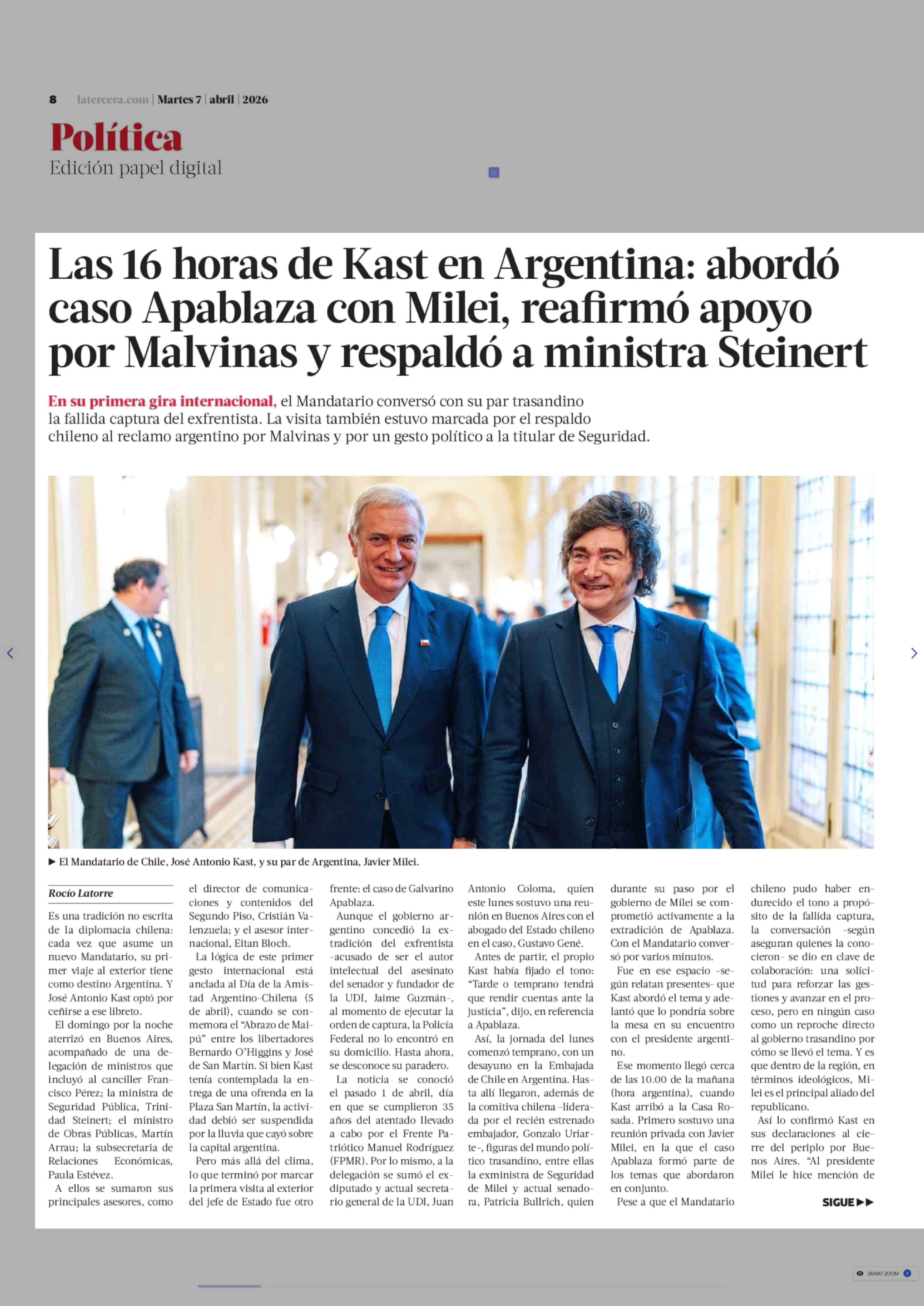 Las 16 horas de Kast en Argentina: abordó caso Apablaza con Milei, reafirmó apoyo por Malvinas y respaldó a ministra Steinert 07-04-2026 La Tercera |
